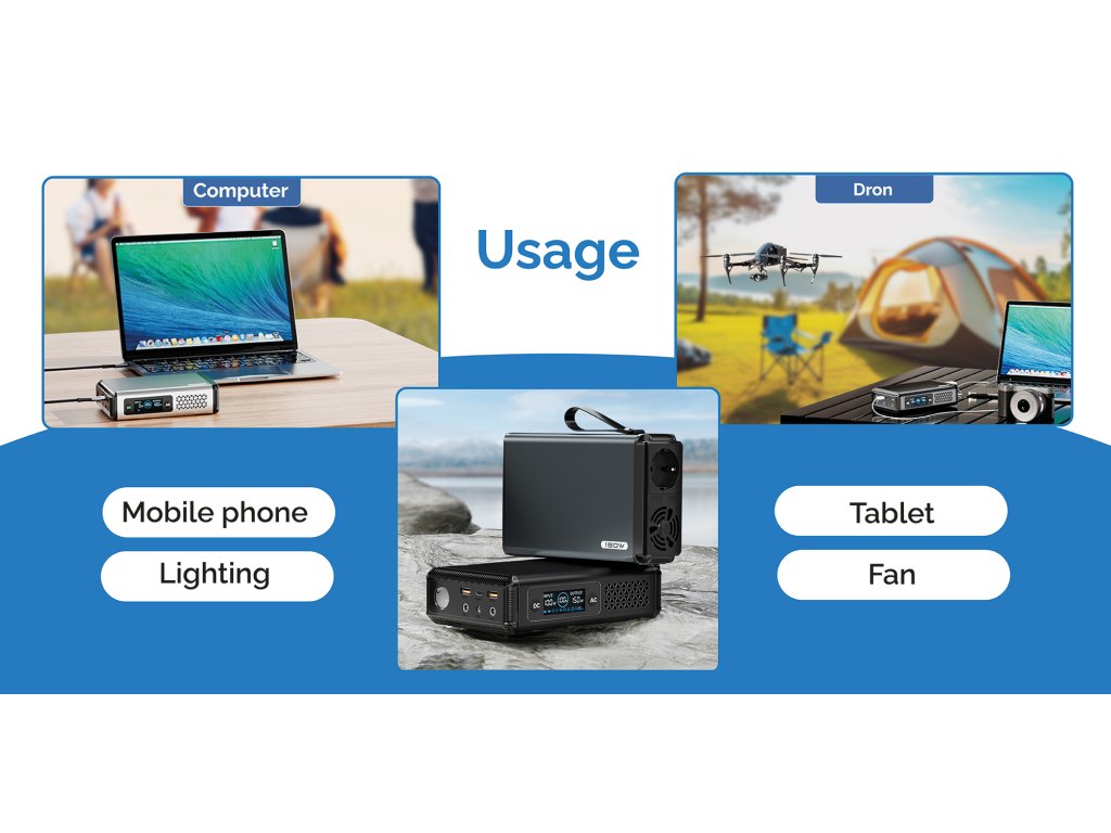 - Univerzální použití díky různým výstupům (USB-C, USB-A, DC jack 5521, AC230V)
