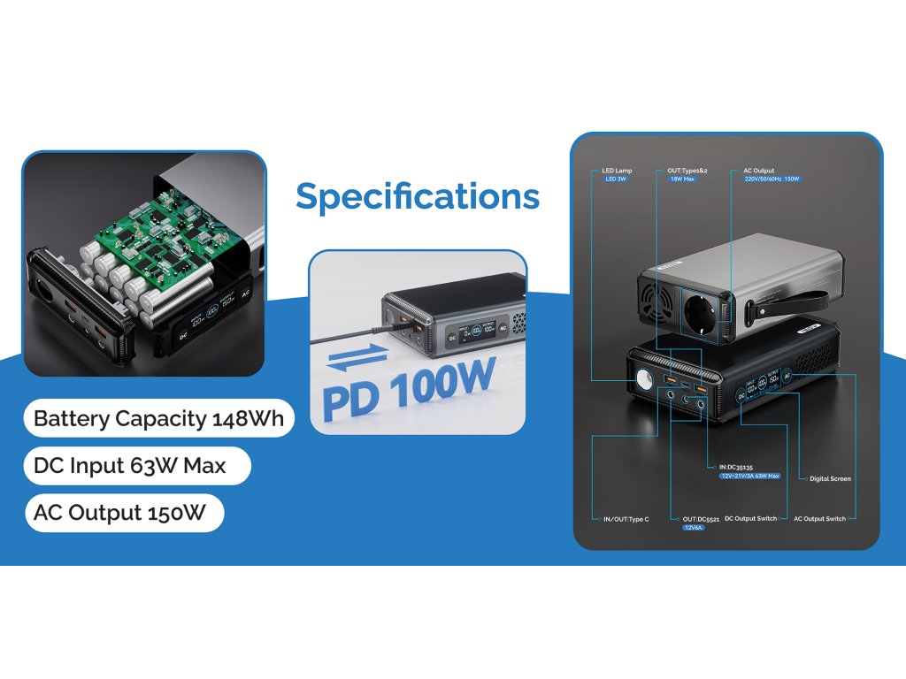 Kapacita baterie 148Wh • AC 230V výstup 150W max. • USB-C PD vstup/výstup 100W max. • 2 x USB-A výstup 18W max. • 2 x DC5521 výstup 72W max. • LED svítilna 3W • Funkce pass-through • váha 1.5 kg