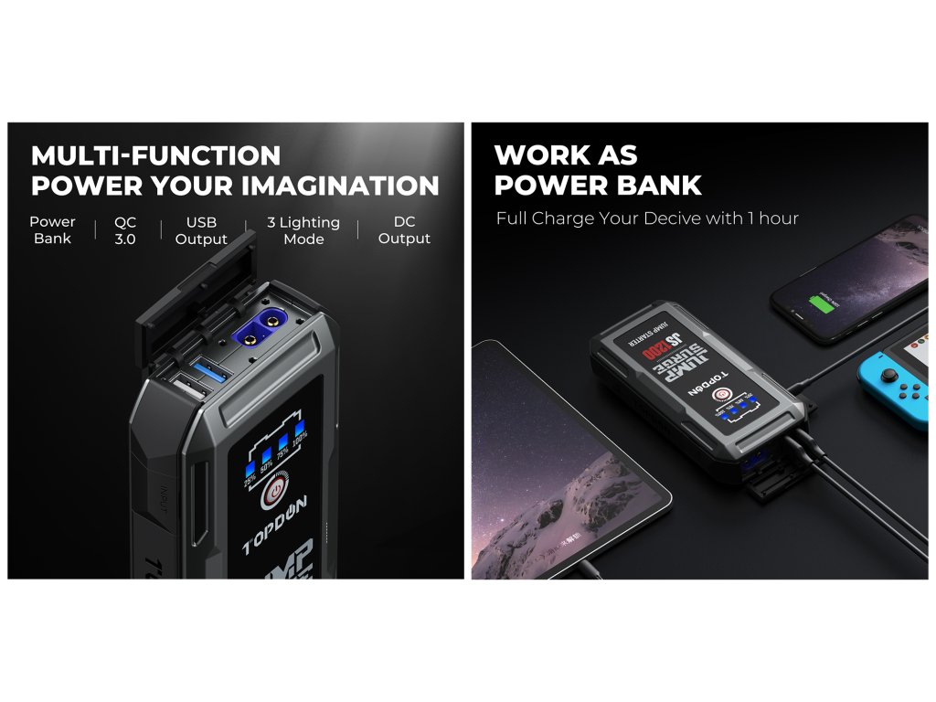 JumpSurge1200 slouží také jako powerbanka! Pomocí dvou USB-A výstupů a kompatibilního kabelu dokáže plně nabít váš smartphone, tablet a jakékoli kompatibilní elektronické zařízení. Navíc podporuje rychlé nabíjení za použití protokolu QC3.0. Dále JumpSurge 1200 podporuje nabíjení jakéhokoliv zařízení pomocí konektoru typu Jack s maximálním výkonem 16,8V/10A max.