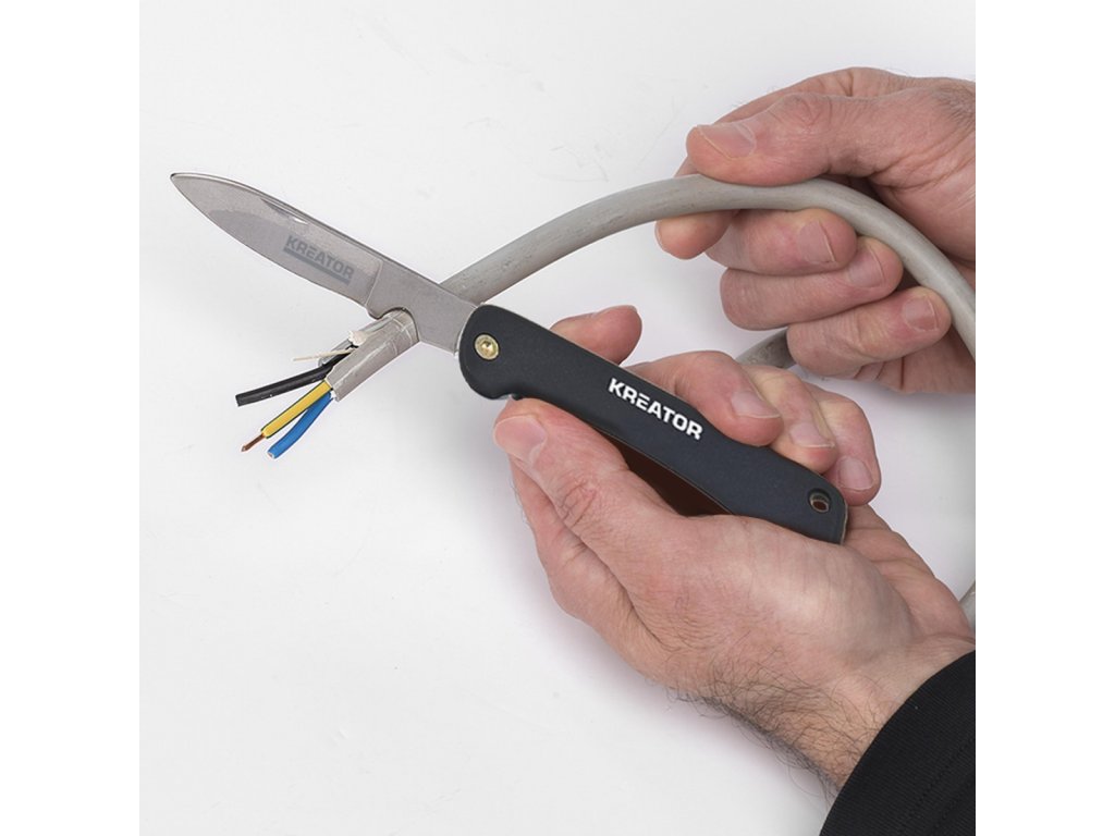 Elektrikářský nůž. Tento elektrikářský nůž KRTH00801 od Kreator je obzvláště užitečným nástrojem při práci s elektrickými kabely a elektroinstalací. Díky ostré čepeli snadno přeříznete jakýkoli vodič na míru. Praktický malý zářez lze použít k rychlému odizolování kabelů. Samotný nůž je skládací...