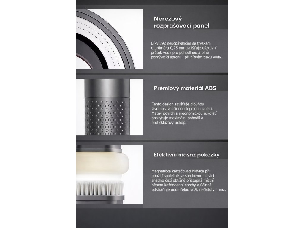 Luxusní sprchová hlavice s nerezovým panelem a hustou sítí 392 mikrotrysek (0,25 mm) vytváří jemný, rovnoměrný a přitom účinný proud vody – pro pocit plného pokrytí i při nižším tlaku.
