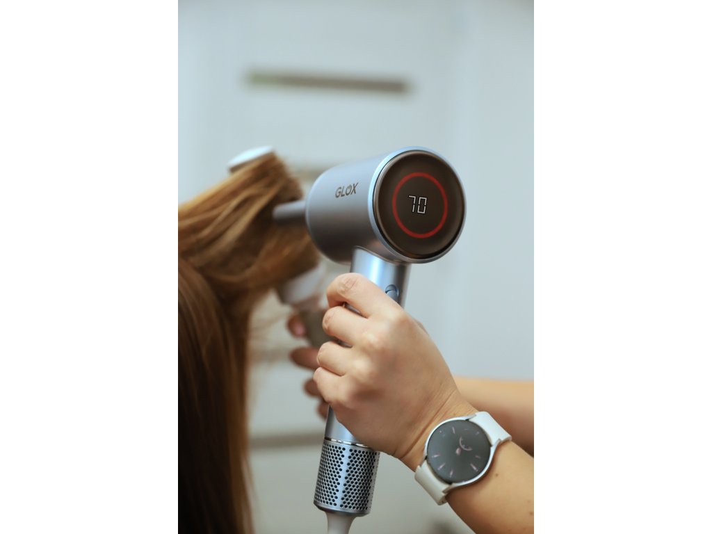 Ionizační fén GLOX D3 G SET je vysoušeč vlasů s pokročilými funkcemi je ideální volbou pro každého, kdo hledá kombinaci výkonu, stylu a moderní technologie. Tento produkt přináší revoluční způsob péče o vlasy, který je efektivní a šetrný zároveň. Fén GLOX D3 G SET Silver je navržen tak, aby poskytoval maximální efektivitu při sušení vlasů. Díky super rychlosti vzduchu je sušení rychlé a efektivní, což šetří váš čas. Čtyři úrovně teploty vzduchu: Uživatelé mohou snadno přizpůsobit teplotu podle svých potřeb, což umožňuje optimální péči o různé typy vlasů. Dvě úrovně rychlosti vzduchu nabízí flexibilitu při výběru rychlosti, což je ideální pro různé styly a požadavky na sušení. Moderní design zahrnuje barevné rozlišení nastavené teploty vzduchu, a digitální displej, který zjednodušuje ovládání a sledování nastavení. Funkce ionizace s 200 miliony záporných iontů pomáhá redukovat krepatění vlasů a zvyšuje jejich lesk, což zajišťuje zdravý a hladký vzhled po každém použití. Nízká hmotnost 520g což zajišťuje lehkost a pohodlí při používání.