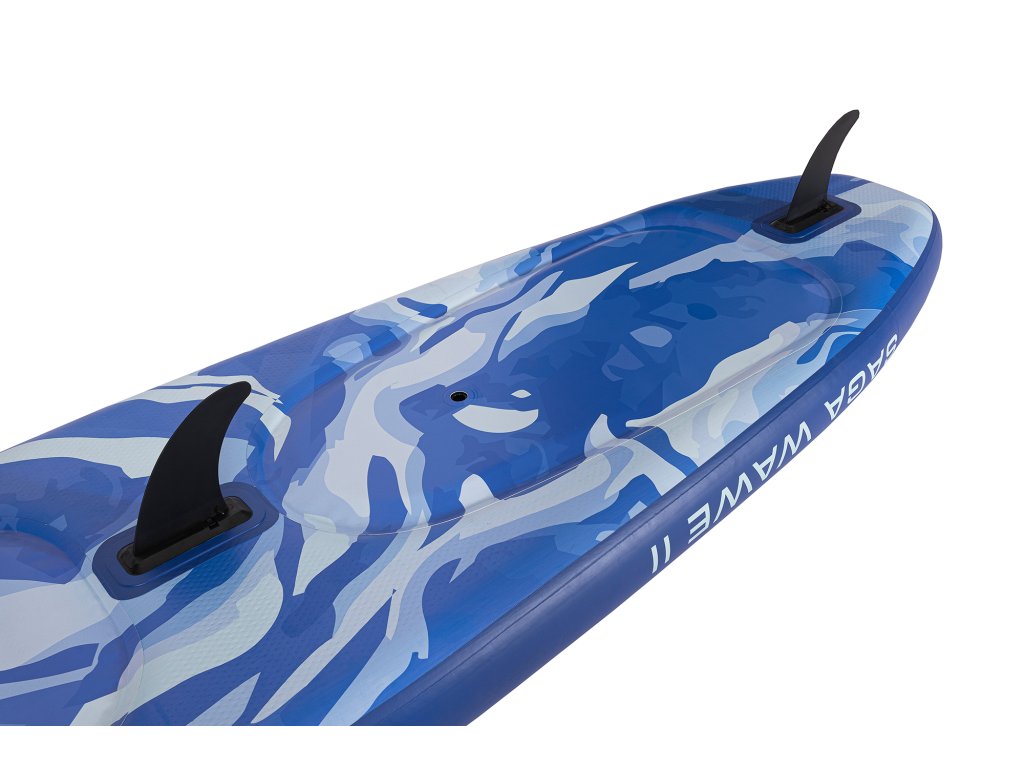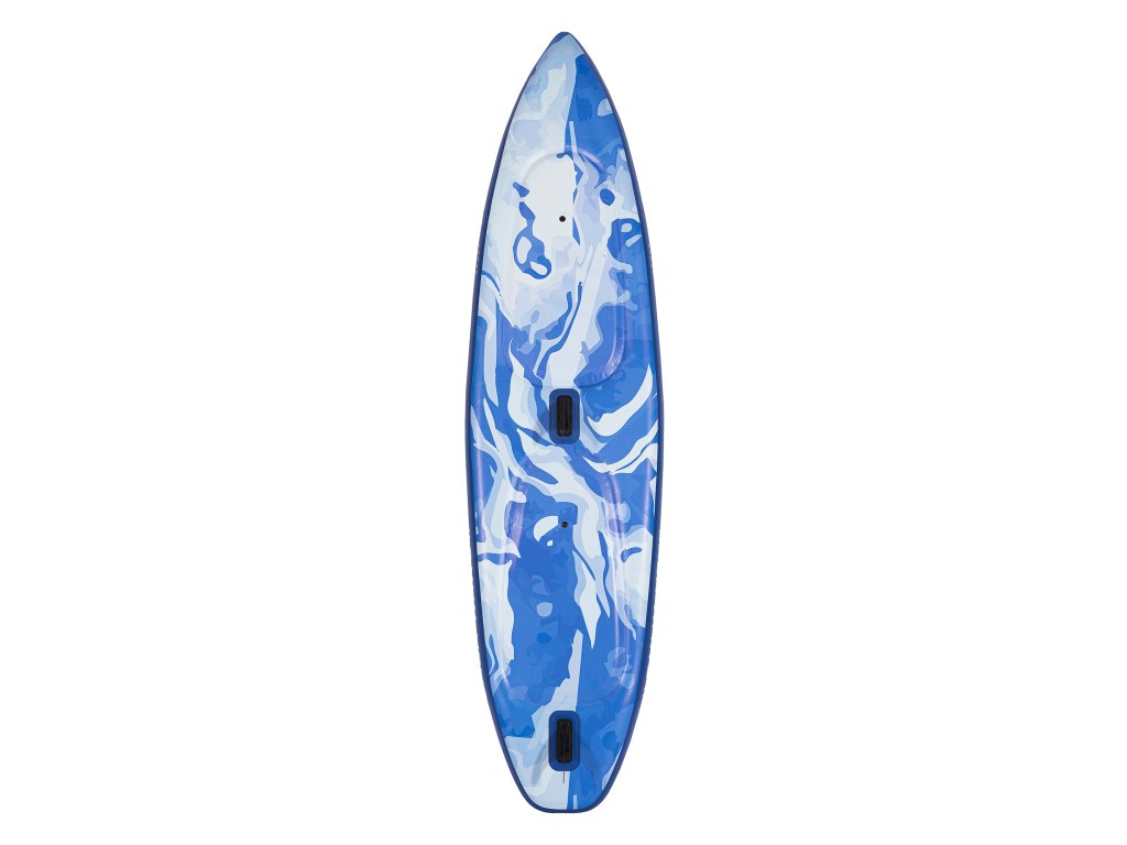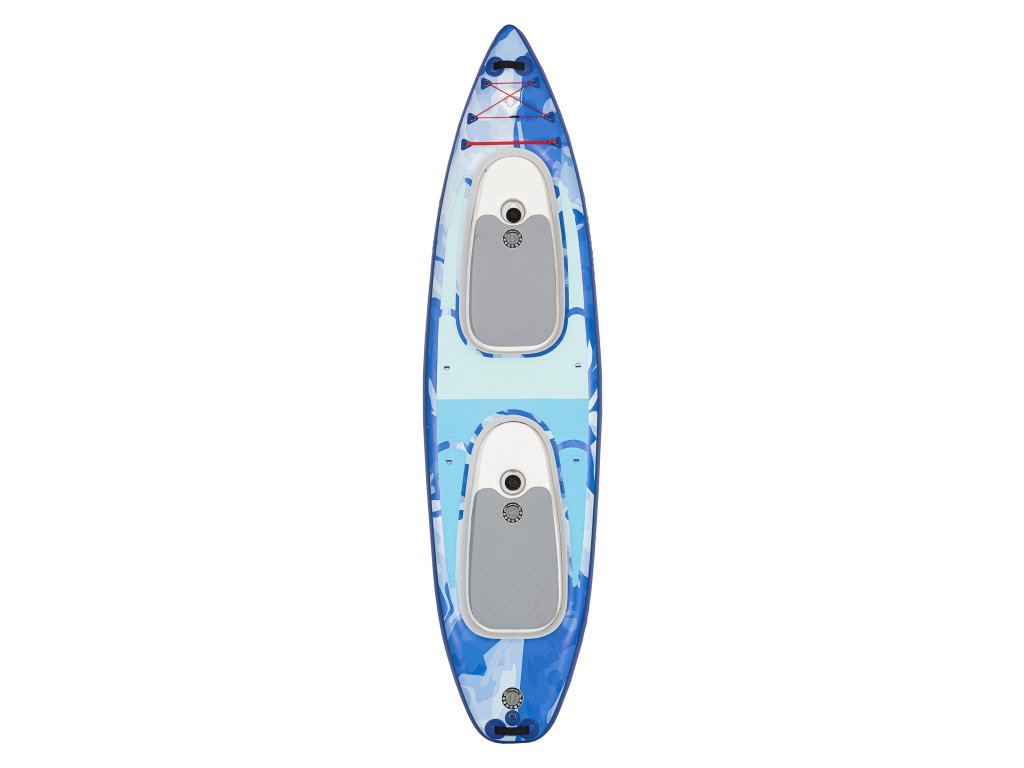 Kajak zaujme výrazným vodním motivem v odstínech modré, který připomíná pohyb vln a dokonale ladí s vodním prostředím. Je vybaven integrovaným sedacím prostorem určeným pro dva jezdce. Spodní strana obsahuje dvě ploutve, které zajišťují lepší stabilitu a snadnější ovládání během jízdy.
