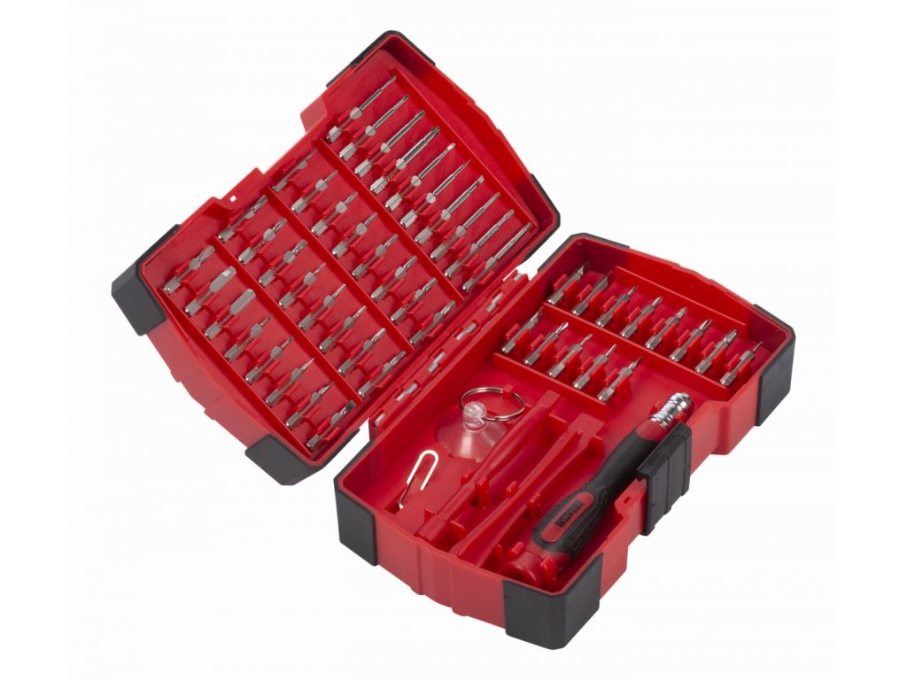 Tato rozsáhlá 52-dílná sada je určena pro přesné opravy nejrůznější druhy elektroniky a drobných spotřebičů. Pomocí přísavky, 2 plastových otvíráků konektorů, rukojeti pro šroubovák, jehly SIM karty a různých druhů přesných bitů můžete snadno provádět pečlivé opravy. Sada je dodávána v praktickém pouzdru s pogumovanými rohy o rozměru 173x113x53 mm. Specifikace: 37 CRV přesných bitů 28 mm: 9 bitů (Torx(R)): T3, T4, T5, T6, T7, T8, T9, T10, T15 2 bity (Torx(R) Tamper Resistant): T8, T10 8 bitů (hex): H0,9, 1,3, 1,5, 2,0, 2,5, 3,0, 3,5, 4 7 bitů (plochý): SL1.0, SL1.5, SL2, SL2.5, SL3, SL3.5, SL4 5 bitů (Philips(R)): PH000, PH00, PH0, PH1, PH2 6 speciálních bitů: 0,8 jehla, U2,6, Y2,0, ★ 0,8, ★ 1,2 △ 2,0 10 CRV přesných bitů 45 mm: 4 bity (Philips(R)): PH000, PH00, PH0, PH1 3 bity (plochý): SL1,5, SL2, SL2.5, 3 bity (Torx(R)): T6, T7, T8 1 rukojeť šroubováku 2 plastové otvíráky konektorů 1 jehla SIM karty 1 přísavka