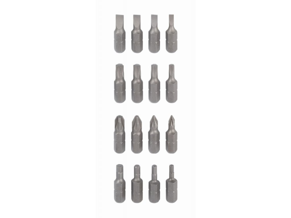 16 různých bitů (4x hex , 4x plochý, 4x Philips(R) a 4x Torx(R))