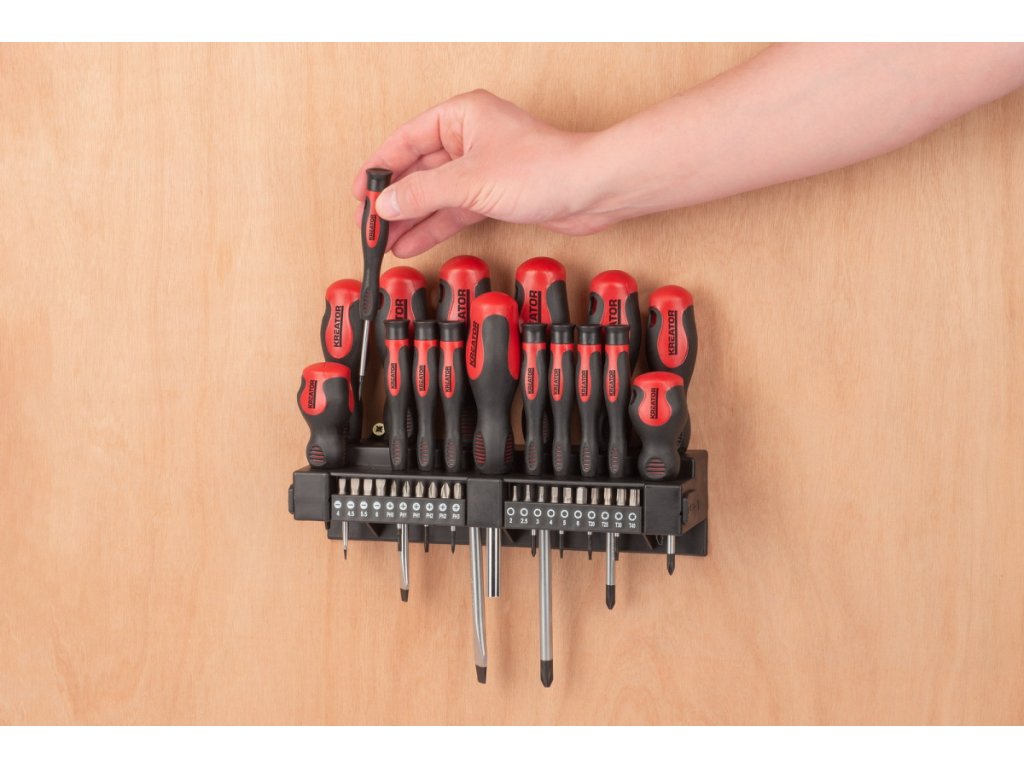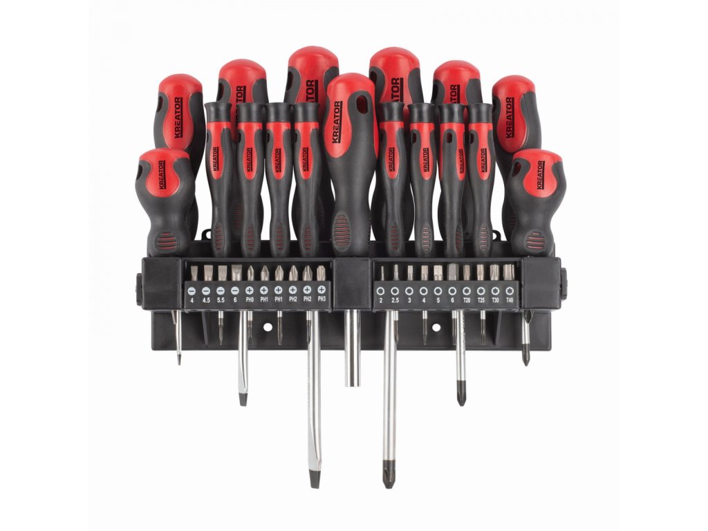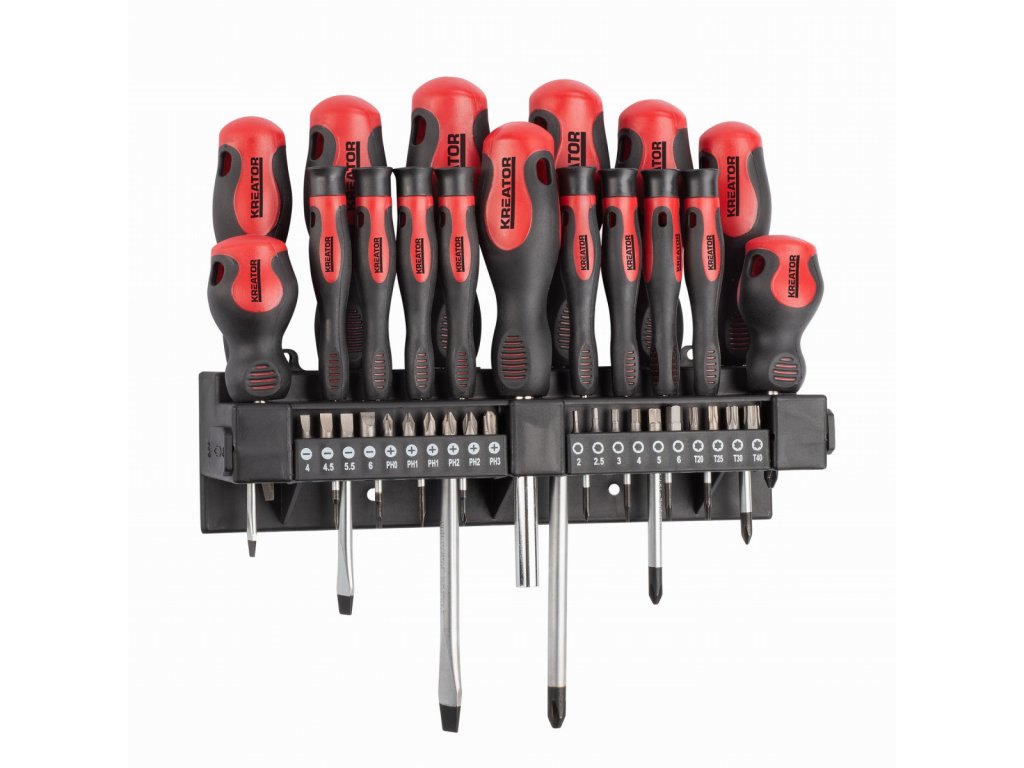 Sada šroubováků a bitů 37ks. Tato 37dílná sada šroubováků a bitů KRT400010 od Kreator nabízí kromě různých šroubováků a šroubovacích bitů i praktický držák pro montáž na stěnu. Lze jej připevnit pomocí několika šroubů. Díky tomu jsou šroubováky úhledně pohromadě a na dosah. Všechny šroubováky...