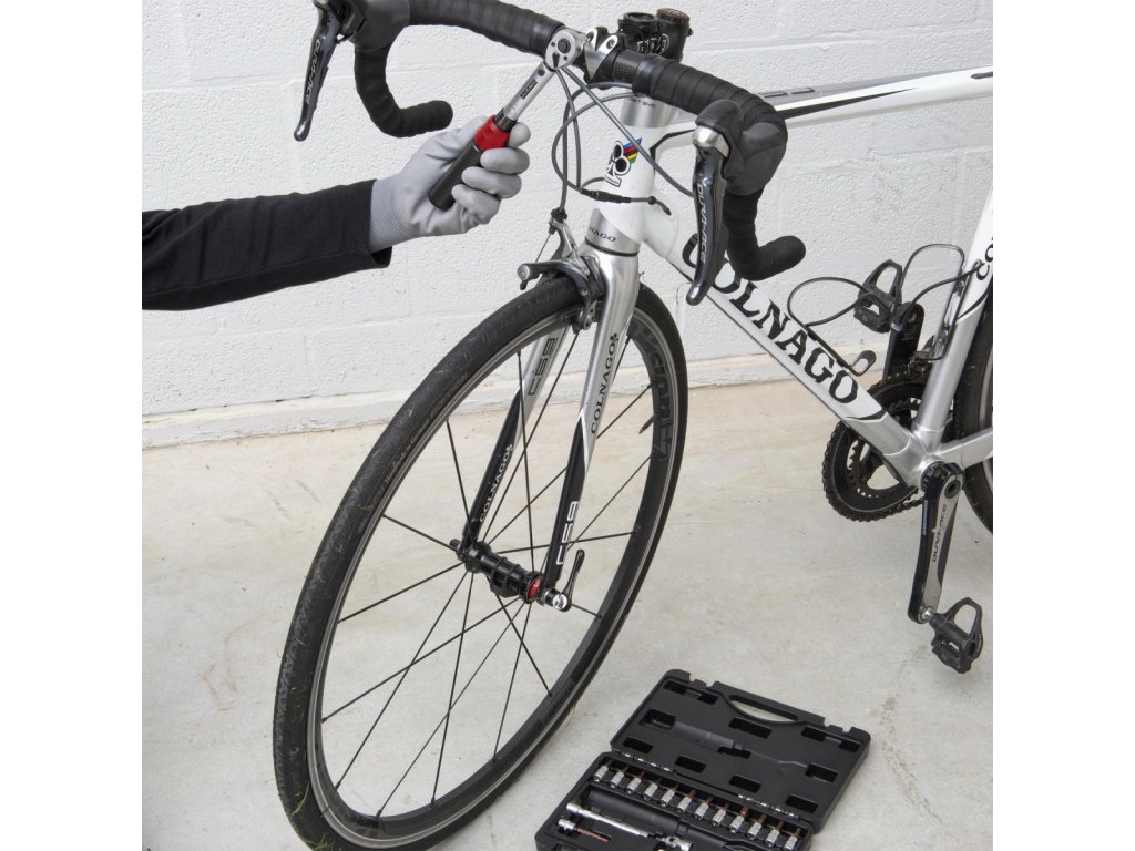 Pokud pracujete s citlivými materiály, je důležité při utahování matic a šroubů použít správnou sílu. Díky této sadě momentových klíčů KRT503101 Kreator můžete pracovat s absolutní přesností. Utahovací moment je snadno nastavitelný (2 – 20 Nm) a cvaknutí, které uslyšíte při utahování, zajišťuje správné utažení matice nebo šroubu. Tento momentový klíč má připojení 1/4 a je ideální pro jemnou práci, např. kola nebo díly motoru. Směr lze také nastavit, takže KRT503101 může utahovat i povolovat matice a šrouby. Hliníková rukojeť činí klíč robustním, ale lehkým pro větší uživatelský komfort. Tato sada je navíc dodávána s 16 bity (T10-T15-T20-T25-T30-H2-H2.5-H3-H4-H5-H6-H8-H10-PH1-PH2-PH3), 100 mm H5 bit, nástavec, univerzální kloub pro úhelníky a adaptér 1/4 na 3/8. Vše, co potřebujete k přesné práci, se dodává v praktickém úložném kufříku, který drží všechny díly pohromadě a zároveň chrání momentový klíč, takže zůstane správně kalibrovaný. Tento momentový klíč je určen pro fandy. Pro profesionální použití se doporučuje klíč nechat zkalibrovat a poté jej nechat každoročně překalibrovat.