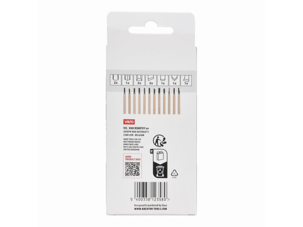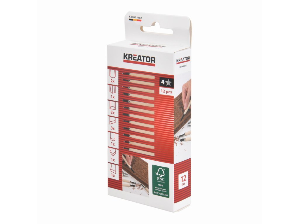Tato sada KRTH23602 od Kreator obsahuje 12 miniaturních dlát na dřevo s dřevěnou rukojetí, která splňují certifikaci FSC(R) C210784. Dláta jsou ideální pro přesnou a detailní práci se dřevem. Jsou dlouhá 135 mm a mají hlavici širokou 6 mm.