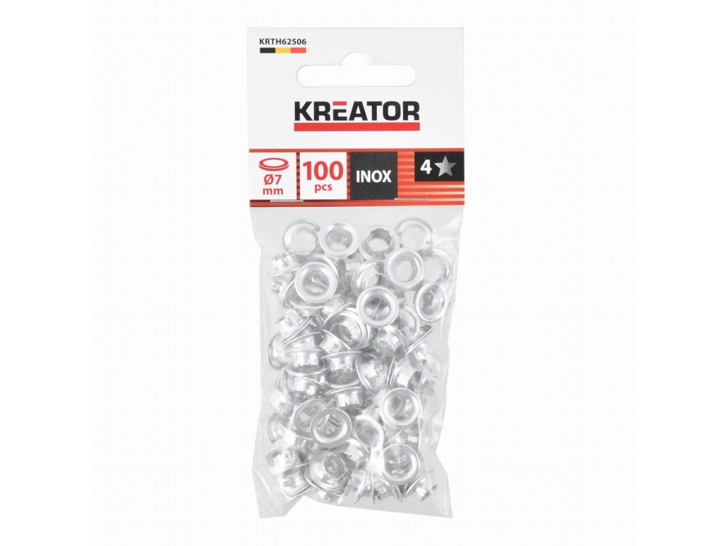 Tyto nýtovací očka KRTH62506 od Kreator mají vnitřní průměr 7 mm a lze je připevnit k textiliím a jiným tenkým materiálům pomocí kleští na nýtovací očka.