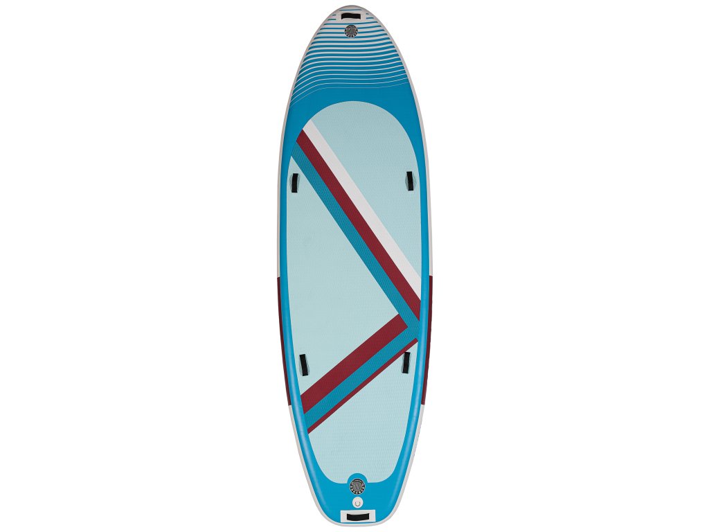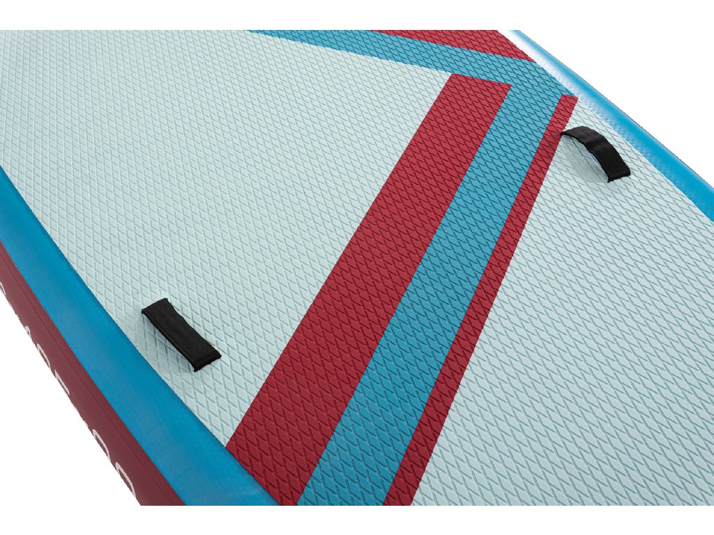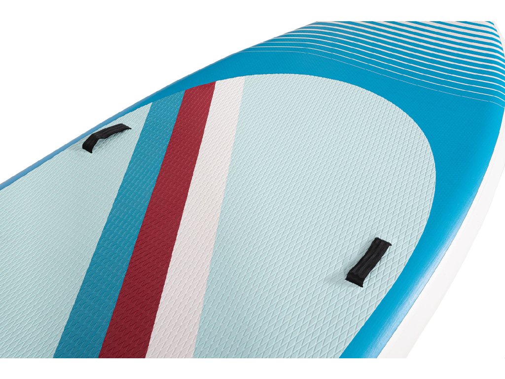 Tento velký paddleboard zaujme moderním a hravým designem v modré, bílé a červené. Protiskluzová EVA podložka zajišťuje pohodlný a stabilní postoj během jízdy. Spodní strana je elegantně jednoduchá a doplněná třemi ploutvemi, které zvyšují stabilitu a usnadňují ovládání na vodě.