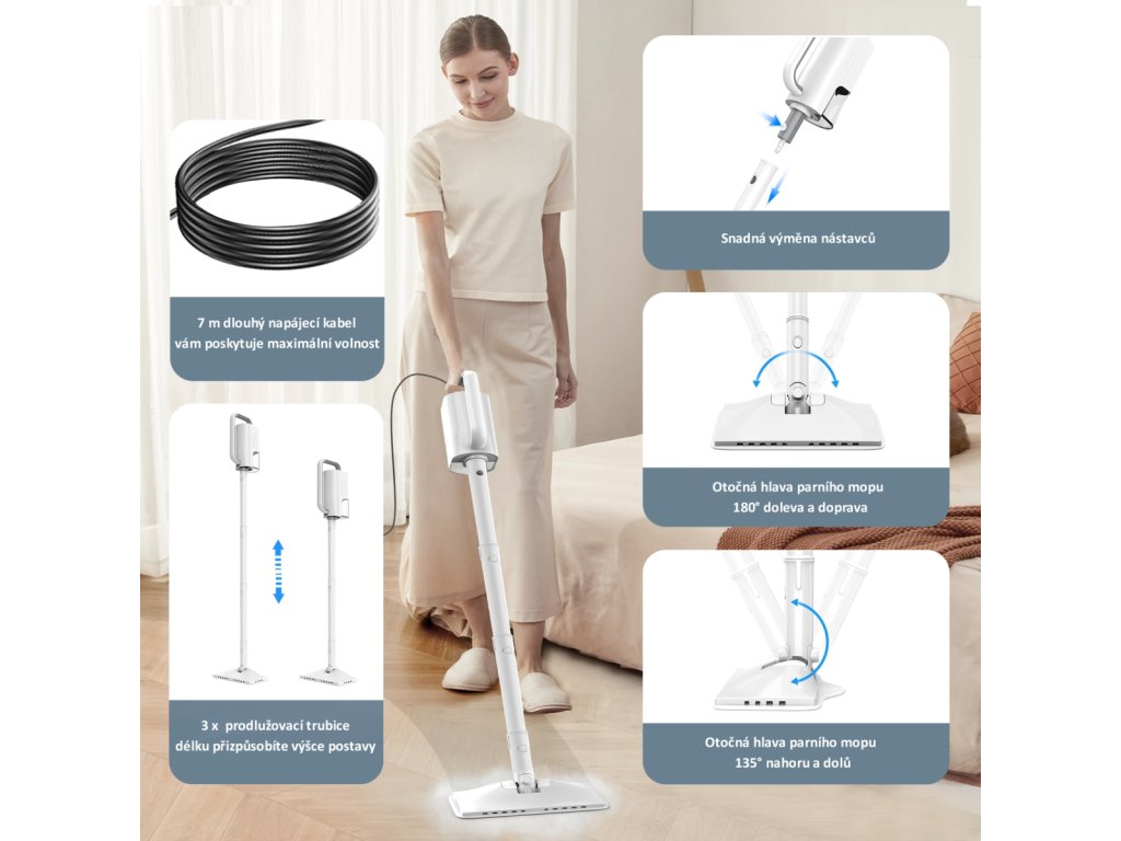 Parní mop Teendow – čistota a dezinfekce domácnosti bez chemie Užijte si dokonale čistou a hygienickou domácnost díky parnímu mopu Teendow, který odstraní až 99 procent bakterií pomocí horké páry. Stačí naplnit nádržku čistou filtrovanou vodou a během 15 vteřin je mop připraven k akci. Žádné čisticí prostředky ani chemikálie – pouze čistá pára o teplotě až 110 stC. Parní mop Teendow je ideální pro čištění všech typů podlah – dlažby, dřeva, vinylu i laminátu. Díky bohatému příslušenství však jeho využití nekončí u podlah – snadno s ním vyčistíte okna, dveře, stěny, kuchyňské linky, koupelny, závěsy, čalounění i dětské hračky. Vyberte si ze dvou režimů páry (minimální a maximální) podle typu povrchu. Ergonomický design a nízká hmotnost zaručují pohodlné ovládání i při delším používání. Parní mop Teendow vám pomůže odstranit mastnotu, prach, alergeny a bakterie z vašeho domova rychle, efektivně a ekologicky. Díky moderní technologii parního čištění je Teendow skvělou volbou pro každého, kdo hledá výkonný parní mop bez chemie pro snadný a zdravý úklid.
