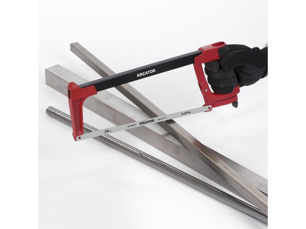 Tato pevná kovová pila KRTH80407 od Kreator je vybavena odolným listem vyrobeným z kvalitní uhlíkové oceli. Speciální je možnost uchycení listu dvěma různými způsoby, díky kterým si snadno nastavíte úhel řezu a můžete řezat bez omezení rámem. Pilový list má délku 300 mm a jeho napnutí lze upravit pomocí křídlové matice.