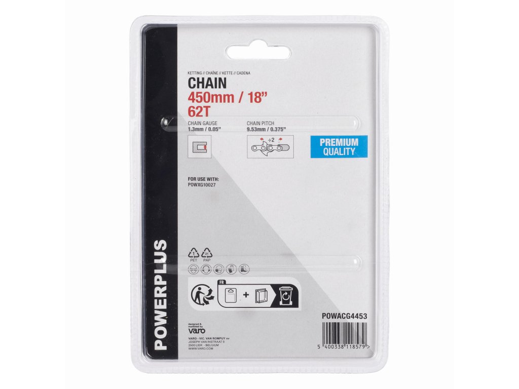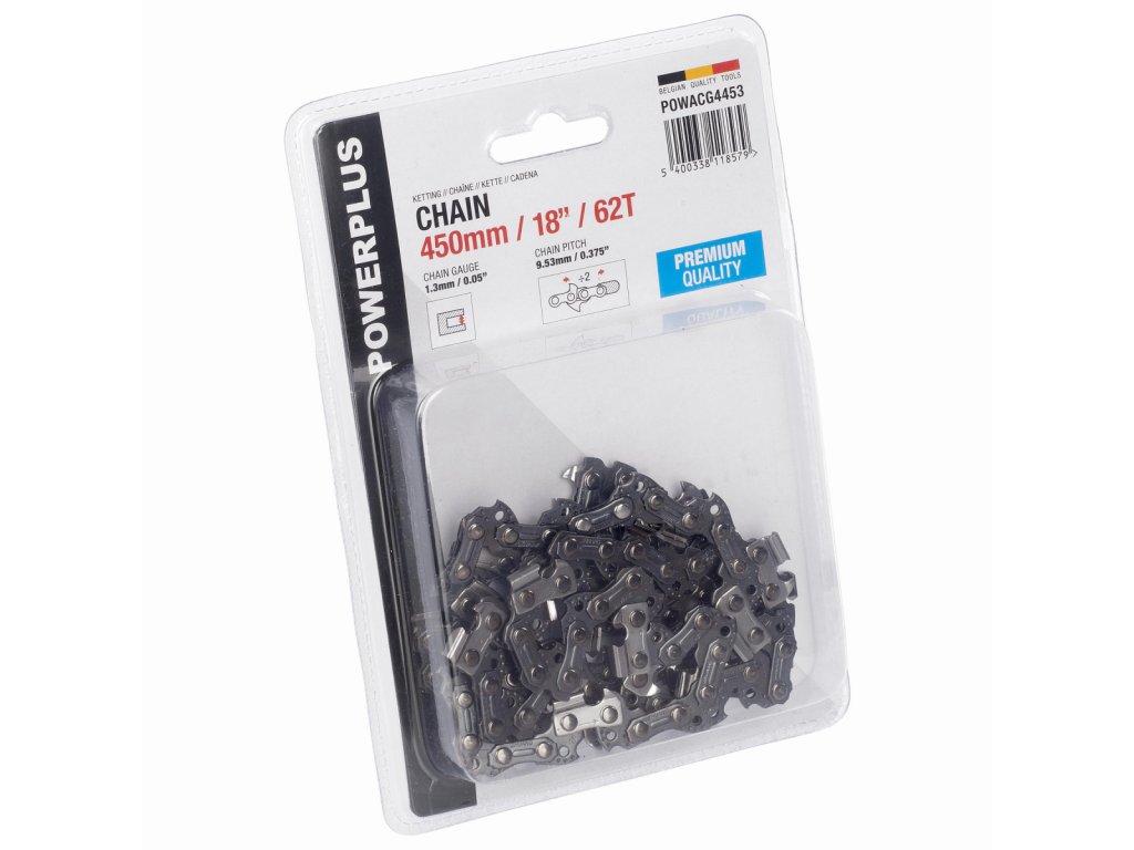 Pilový řetěz 18" (450mm) 62T - PREMIUM. Tento pilový řetěz POWACG4453 od PowerPlus prvotřídní kvality má vylepšenou geometrickou ostrost. Jeho otočné články eliminují tření a zaručují velmi čistý řez. Řetěz je kompatibilní s motorovou pilou Powerplus POWXG10027. Tímto vysoce kvalitním řetězem...