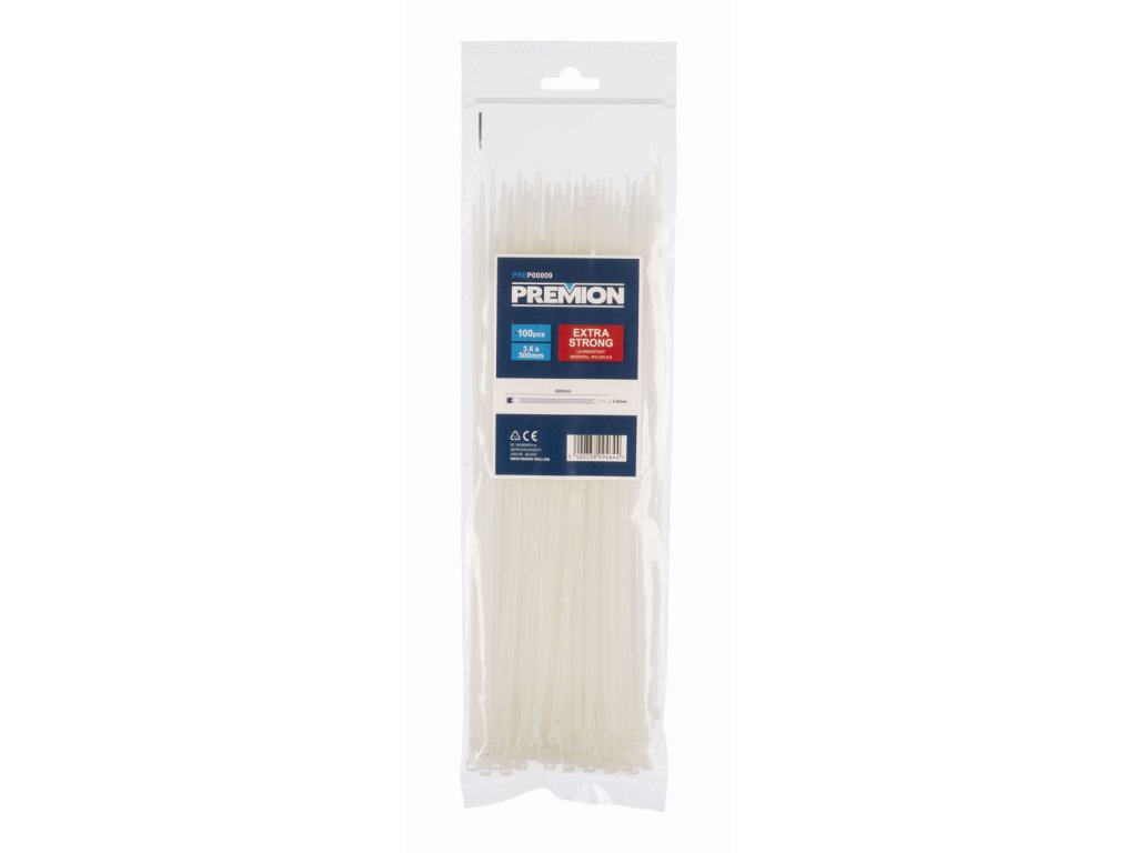 Tato sada PREP00009 od Premion obsahuje 100 ks bílých nylonových stahovacích pásek 3,6 x 300 mm. Tyto extra pevné stahovací pásky mají vysokou pevnost v tahu. Použijte je k úhlednému svázání kabelů nebo ke snadnému vzájemnému spojení předmětů. Úhledně ukryjte kabely a vodiče například ve své kanceláři nebo dílně tím, že je svážete pomocí těchto kabelových stahovacích pásků. Navíc jsou tyto stahovací pásky odolné vůči UV záření.