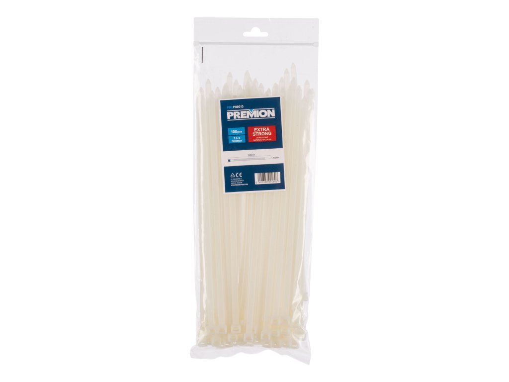 Tato sada PREP00013 od Premion obsahuje 100 ks bílých nylonových stahovacích pásek 7,6 x 300 mm. Tyto extra pevné stahovací pásky mají vysokou pevnost v tahu. Použijte je k úhlednému svázání kabelů nebo ke snadnému vzájemnému spojení předmětů. Úhledně ukryjte kabely a vodiče například ve své kanceláři nebo dílně tím, že je svážete pomocí těchto kabelových stahovacích pásků. Navíc jsou tyto stahovací pásky odolné vůči UV záření.