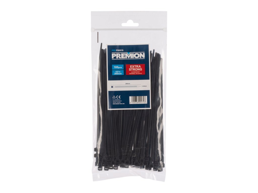 Tato sada PREP00019 od Premion obsahuje 100 ks černých nylonových stahovacích pásek 4,8 x 200 mm. Tyto extra pevné stahovací pásky mají vysokou pevnost v tahu. Použijte je k úhlednému svázání kabelů nebo ke snadnému vzájemnému spojení předmětů. Úhledně ukryjte kabely a vodiče například ve své kanceláři nebo dílně tím, že je svážete pomocí těchto kabelových stahovacích pásků. Navíc jsou tyto stahovací pásky odolné vůči UV záření.
