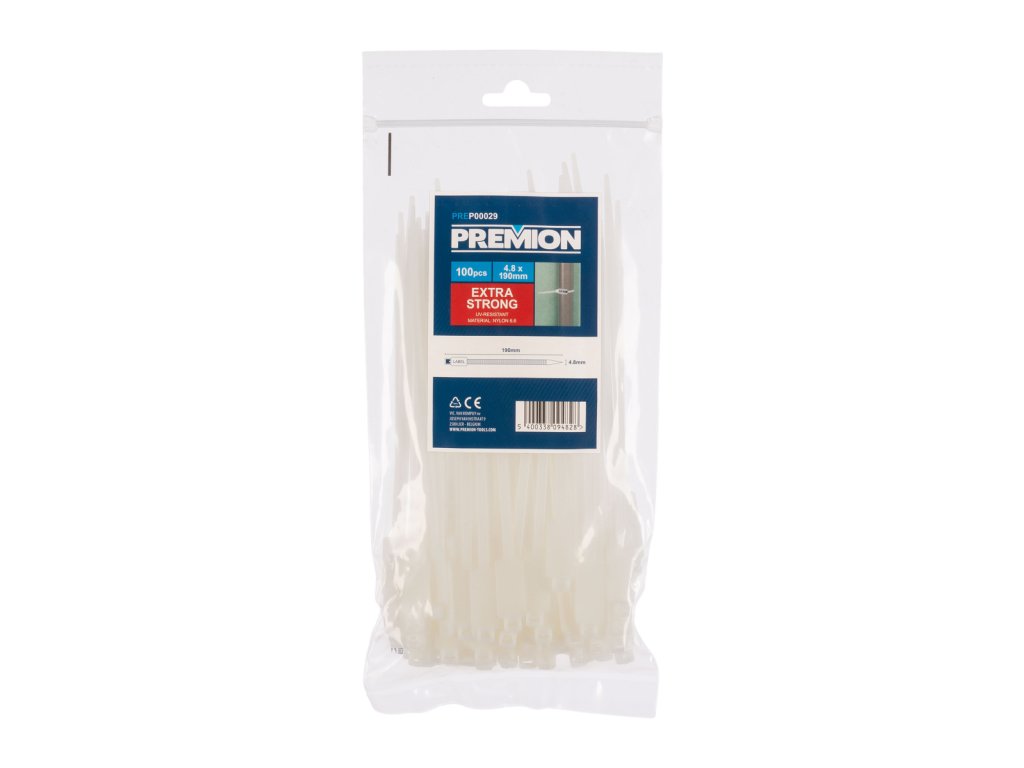 Tato sada PREP00029 od Premion obsahuje 100 ks bílých nylonových stahovacích pásek 4,8 x 190 mm s popisným štítkem. Tyto extra pevné stahovací pásky mají vysokou pevnost v tahu. Použijte je k úhlednému svázání kabelů nebo ke snadnému vzájemnému spojení předmětů. Úhledně ukryjte kabely a vodiče například ve své kanceláři nebo dílně tím, že je svážete pomocí těchto kabelových stahovacích pásků. Navíc jsou tyto stahovací pásky odolné vůči UV záření.