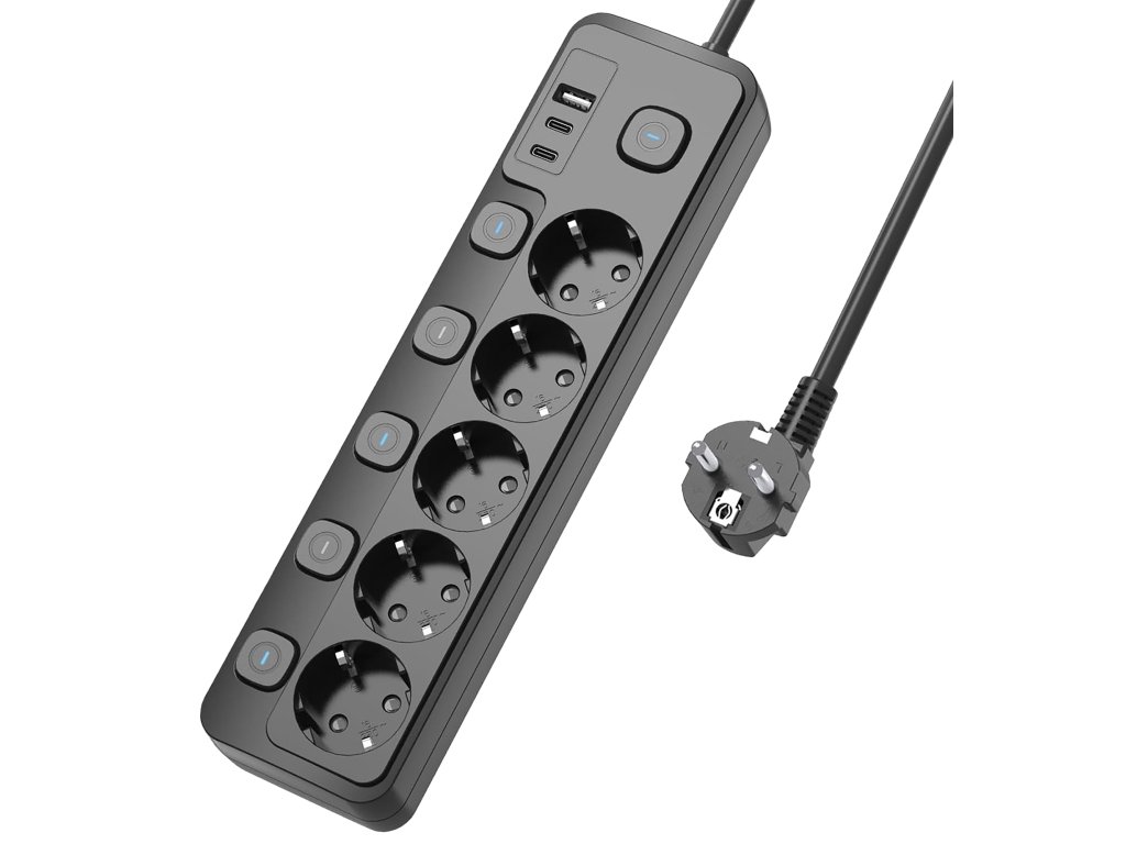 Prodlužovací zásuvka • rozbočovač • 5 x AC výstup (230V, 16A) • 1 x USB-A výstup 18W(5V/3A, 9V/2A, 12V/1,5A) • 2 x USB-C výstup 20W(5V/3A, 9V/2,22A, 12V/1,67A) • hlavní tlačítko ON/OFF • kompaktní rozměry a design • délka kabelu 1,5 m • individuální zapnutí/vypnutí každého AC výstupu • možnost nabíjení až 8 zařízení současně