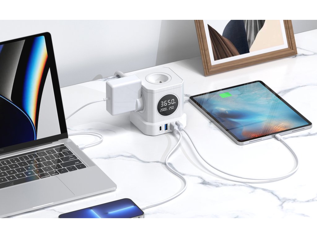 Síťový adaptér • zásuvka • rozbočovač • 4 × AC výstup (220V-250V/16A) • 3 × USB-A výstup 12W (5V/2.4A celkem) • 1 × USB-C výstup 20W (5V/3A,9V/2.22A, 12V/1.67A) • digitální displej zobrazující výkon, spotřebu energie a napětí • tlačítko ON/OFF pro snadné vypnutí • délka kabelu 2m • kompaktní rozměry a moderní design • možnost nabíjení až 8 zařízení současně