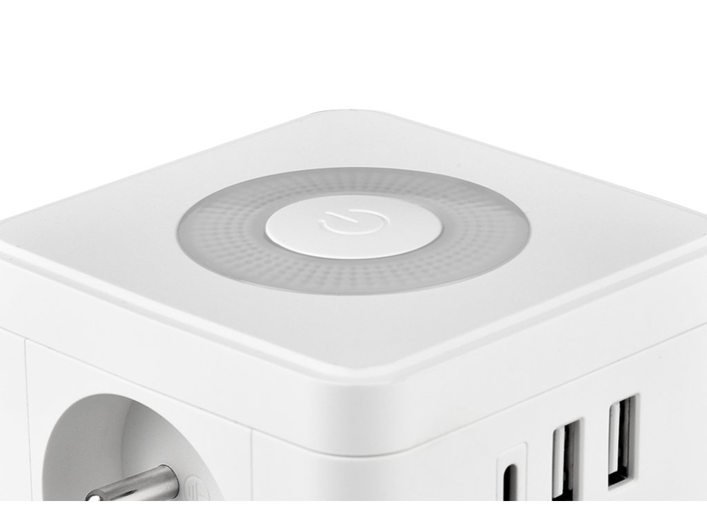 Síťový adaptér • zásuvka • rozbočovač • 2 x AC výstup (230V/16A) • 1 x USB-A výstup 18W (5V/3A, 9V/2A, 12V/1.5A) • 2 x USB-C výstup 20W (5V/3A, 9V/2.22A, 12V/1.67A) • 17W (5V/3A) pro USB-A + USB-C + USB-C • dotykové světlo se třemi intenzitami svícení • kompaktní rozměry a design • možnost nabíjení až 5 zařízení současně