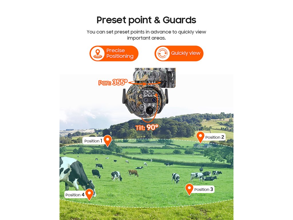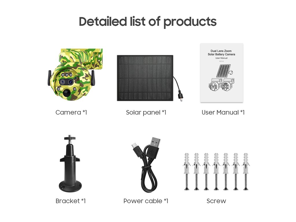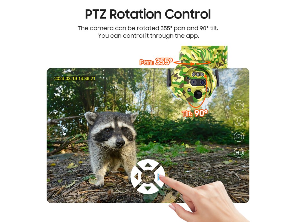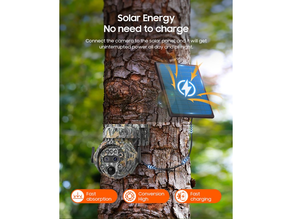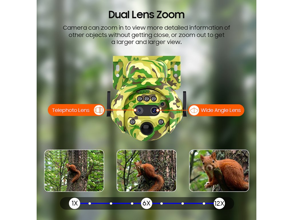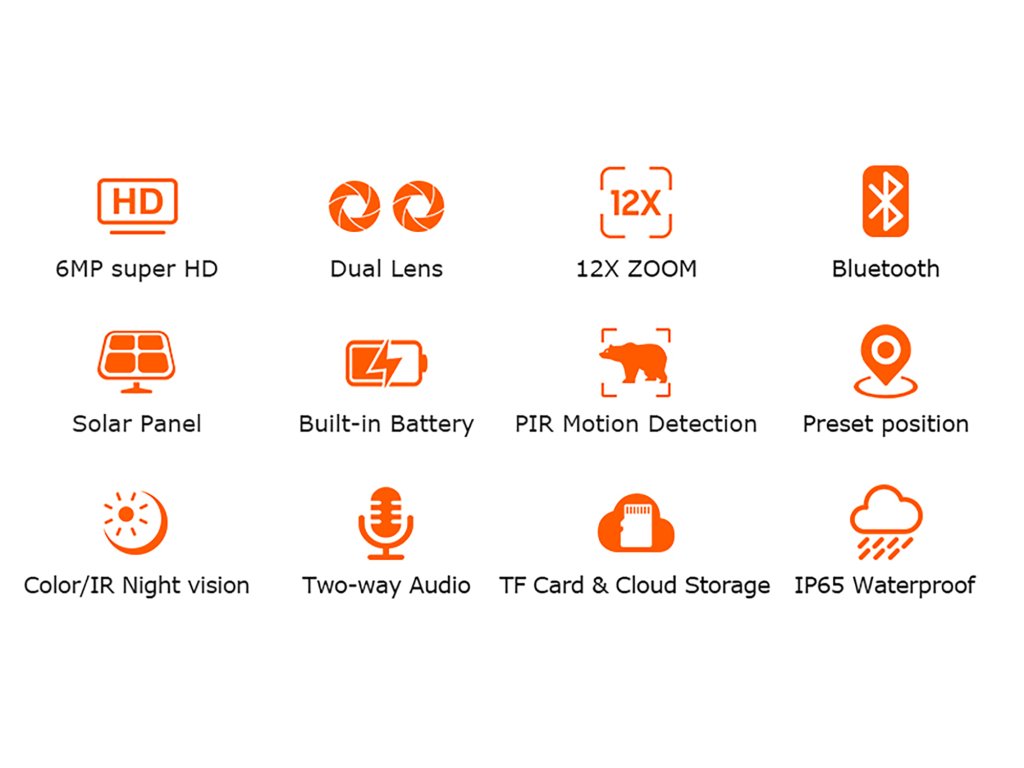 2304 x 1296 rozlišení · 4G připojení · 12x manuální zoom · PIR detekce - pohybový senzor · podpora TF karty až 128GB · cloudové úložiště · aplikace UBOX · kapacita baterie 7800 mAh · dvousměrný přenos zvuku · PTZ otočná kamera 355°/90° · solární napájení · mobilní notifikace · IR a bílé LED osvětlení · funguje pouze se SIM kartou 4G · ovládání přes mobilní aplikaci