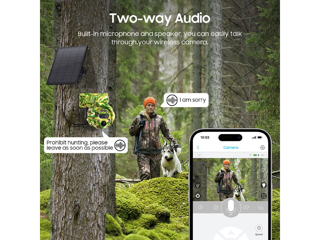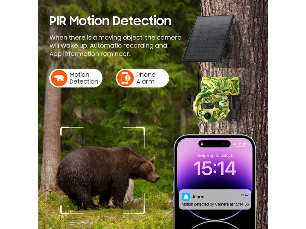 - Pokročilá detekce pohybu: PIR senzor s dosahem 0-12 metrů spolehlivě detekuje lidi a automaticky spustí alarm, který vás okamžitě upozorní na neobvyklé aktivity.