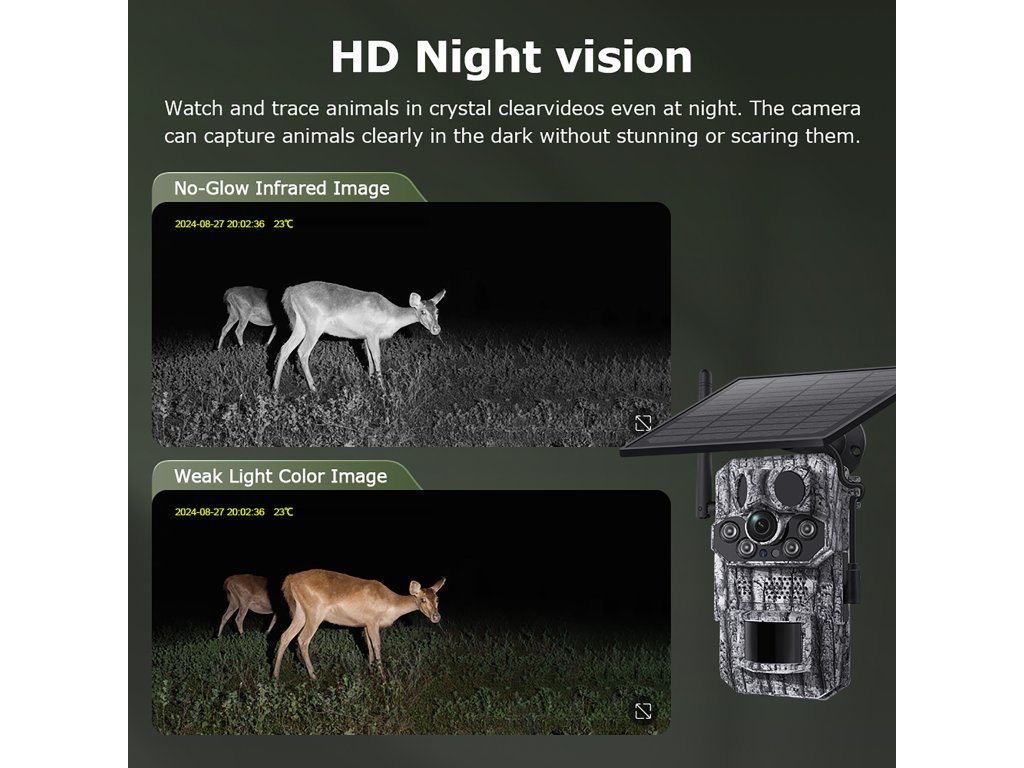- Solární napájení: 5W monokrystalický křemíkový solární panel zajišťuje ekologické a udržitelné napájení, doplněné o výkonnou baterii s kapacitou 7800mAh.