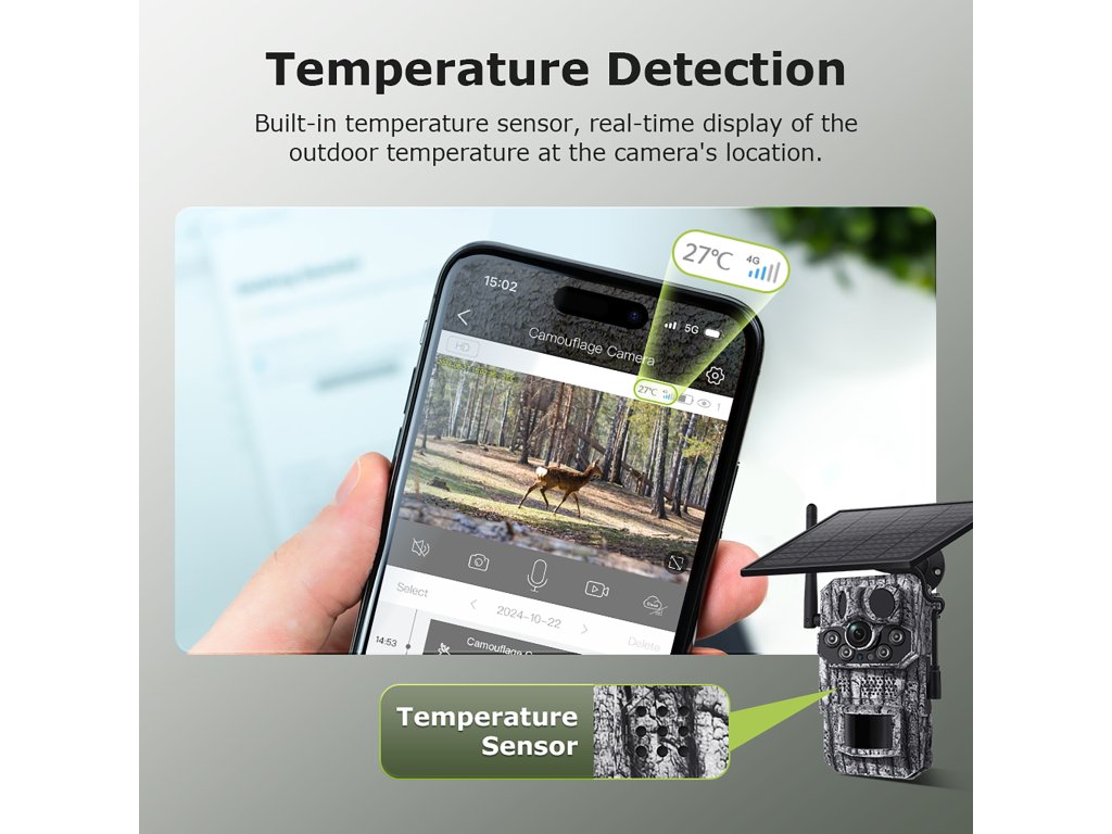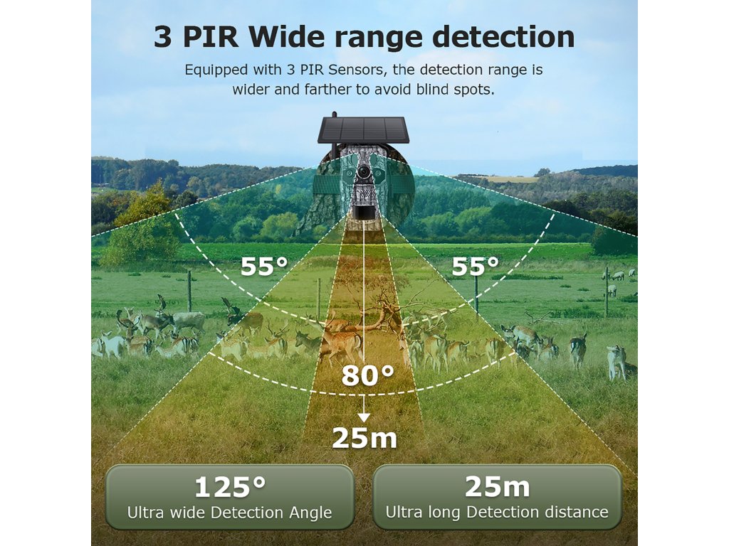 Kamera je vybavena PIR senzorem, který spolehlivě detekuje pohyb až na vzdálenost 20 metrů. Navíc disponuje funkcí detekce teploty a rozpoznávání zvířat s AI.
