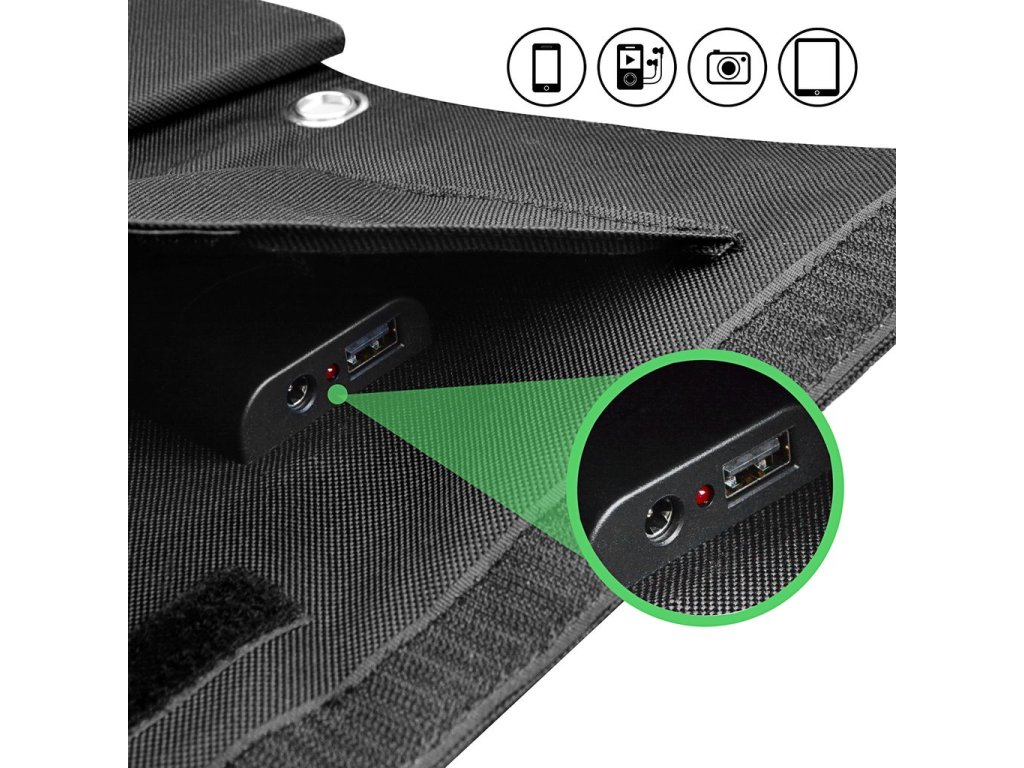 Díky USB výstupu máte dostatek energie pro veškerá zařízení do 5V/2,4A max. Pomocí DC výstupu můžete nabíjet elektroniku do 19V/1,5A. Solární panel můžete využívat při všech outdoorových aktivitách. Stačí použít vhodnou redukci z USB pro vaše zařízení.