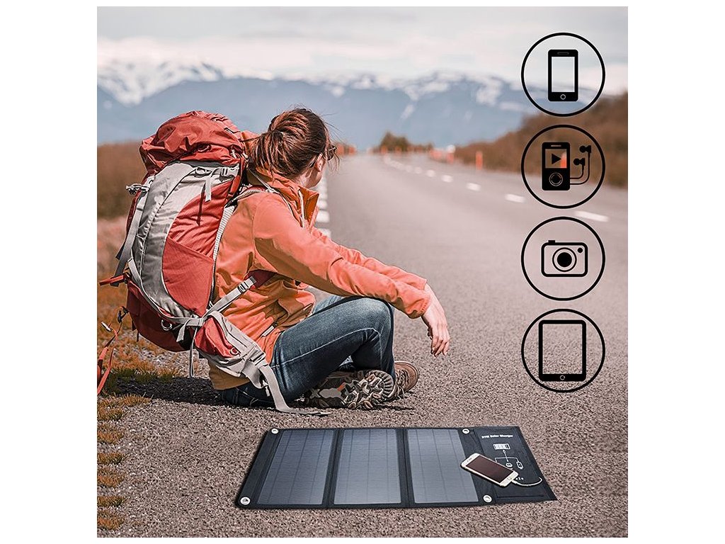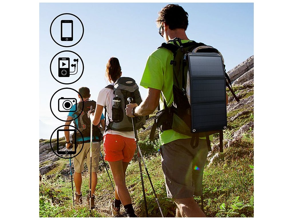 - Díky vysoké účinnosti přeměny sluneční energie solárních panelů, na energii elektrickou, můžete nabíjet všechna vaše drobná zařízení včetně značek Samsung, Apple, Nokia, Huawei, LG, Xiaomi, Sony, Panasonic, GOPRO atd.