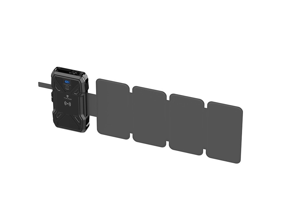 Kapacita 20000mAh (74Wh) • podpora rychlonabíjení QC3.0 a Power Delivery • USB-C vstup až PD18W • USB-C výstup (PD20W max.) • 2 x USB-A výstup (QC22.5W max.) • bezdrátové wireless nabíjení 15W max. • 5 solárních panelů 8W max • IP54 • LED svítilna