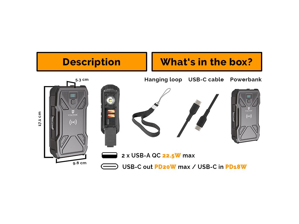 Viking TYR II je vybaven moderními technologiemi nabíjení. Pomocí výstupu USB-C a dvou výstupů USB-A můžete svá zařízení nabíjet rychlostí až 22.5W. Powerbanka podporuje rychlonabíjení a protokoly PD a QC, a to nejen při nabíjení ostatních zařízení! I samotnou powerbanku můžete rychle nabít pomocí USB-C vstupu (PD18W max).