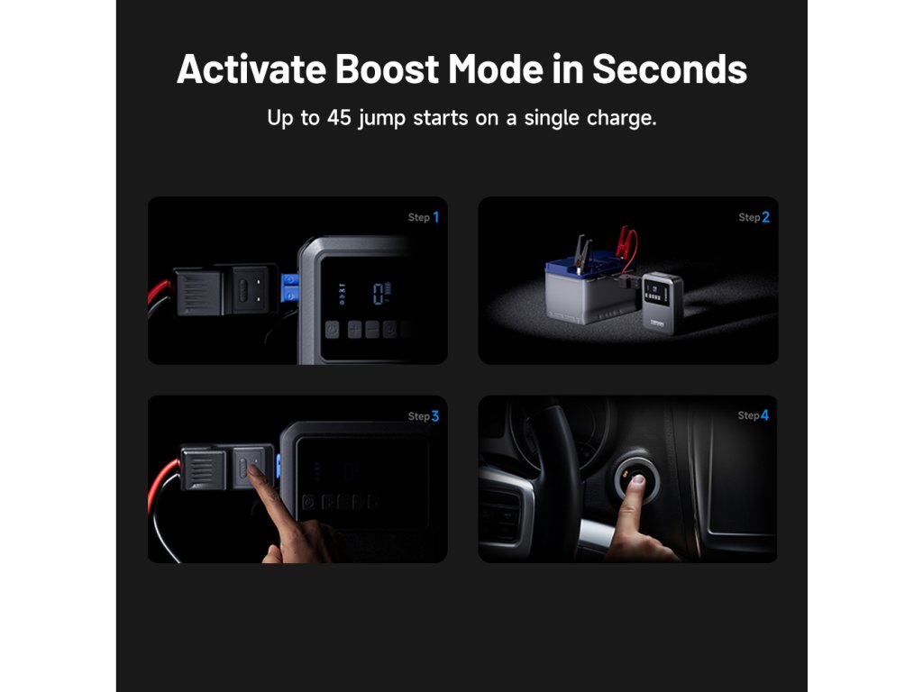 - Startovací proud 1200 A pro 12V vozidla (auta, motorky, SUV, lodě apod.)