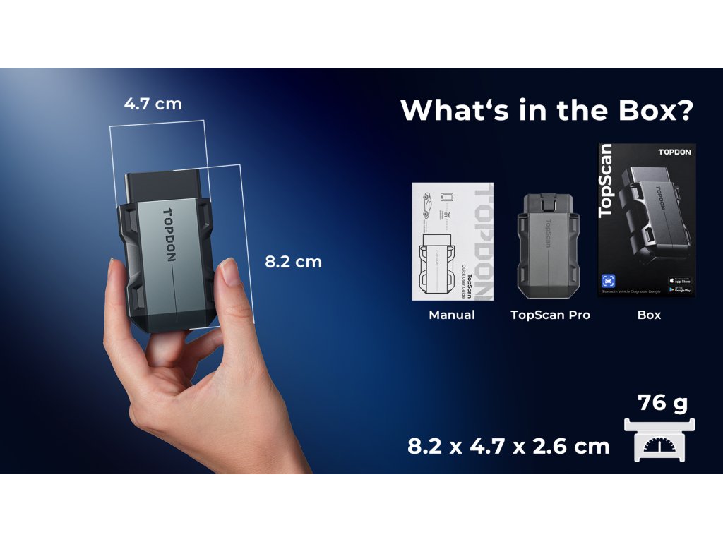 TopScan Pro - je kapesní diagnostické zařízení, které promění váš telefon ve skenovací nástroj a drží krok se svými uživateli, kteří překračují rámec základního skenování. Připojte TopScan Pro k portu OBD2 a začněte diagnostikovat prostřednictvím aplikace pro Android i iOs
