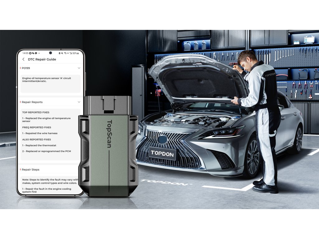TopScan Pro nabízí průvodce opravou DTC, který vás provede procesy a kódy diagnostiky vozidla. Po načtení chybových kódů dokáže TopScan Pro zobrazit definici chybových kódů a nabídnout návod, jak je opravit.