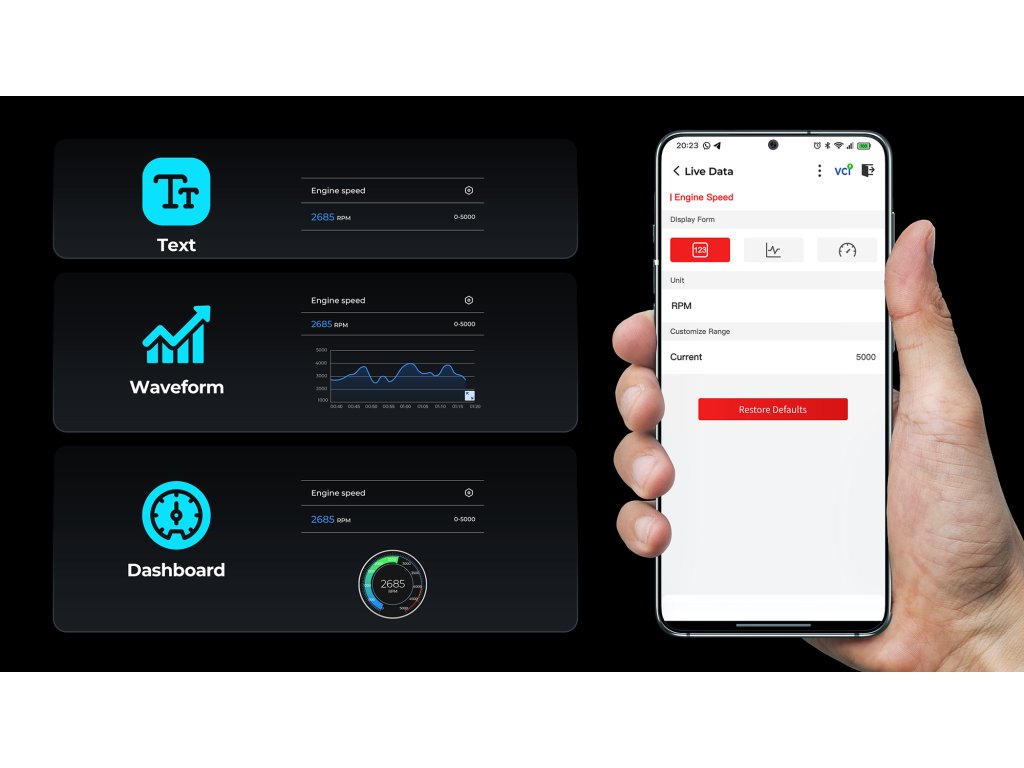 Zobrazení datových toků ve formě textu, grafu nebo grafu podobného přístrojovému panelu. To pomáhá uživatelům intuitivně sledovat změny dat v čase. Použití funkce "Kombinovat" pro grafické zobrazení až 4 datových toků v jednom rozhraní umožňuje uživatelům vyhodnocovat výkonnost pomocí srovnávacích dat a dělat přesná a efektivní rozhodnutí.