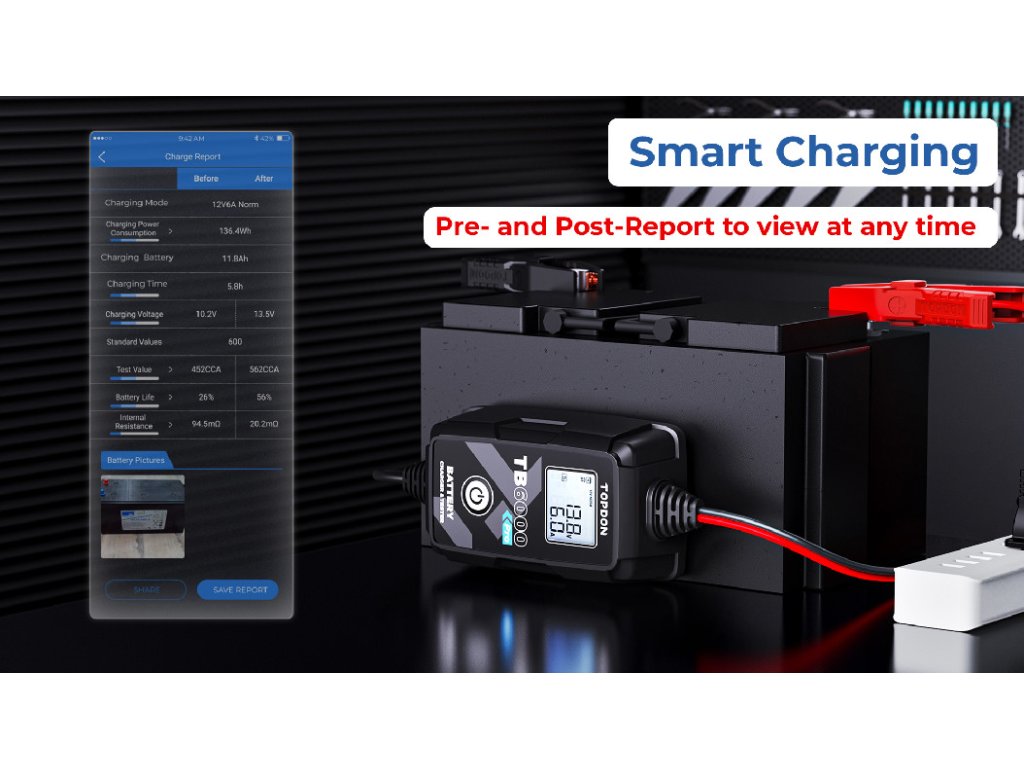 V režimu inteligentního nabíjení provede TB6000Pro automaticky předběžnou detekci baterie, jakmile ji začnete nabíjet. Po té vám umožní znovu otestovat baterii pomocí funkce "View Report", která vygeneruje předběžnou a následnou zprávu. Porovná naměřené údaje včetně CCA, vnitřního odporu, napětí a technického stavu baterie. Report v aplikaci pak jasně zobrazí, o kolik se baterie po nabití zlepšila.