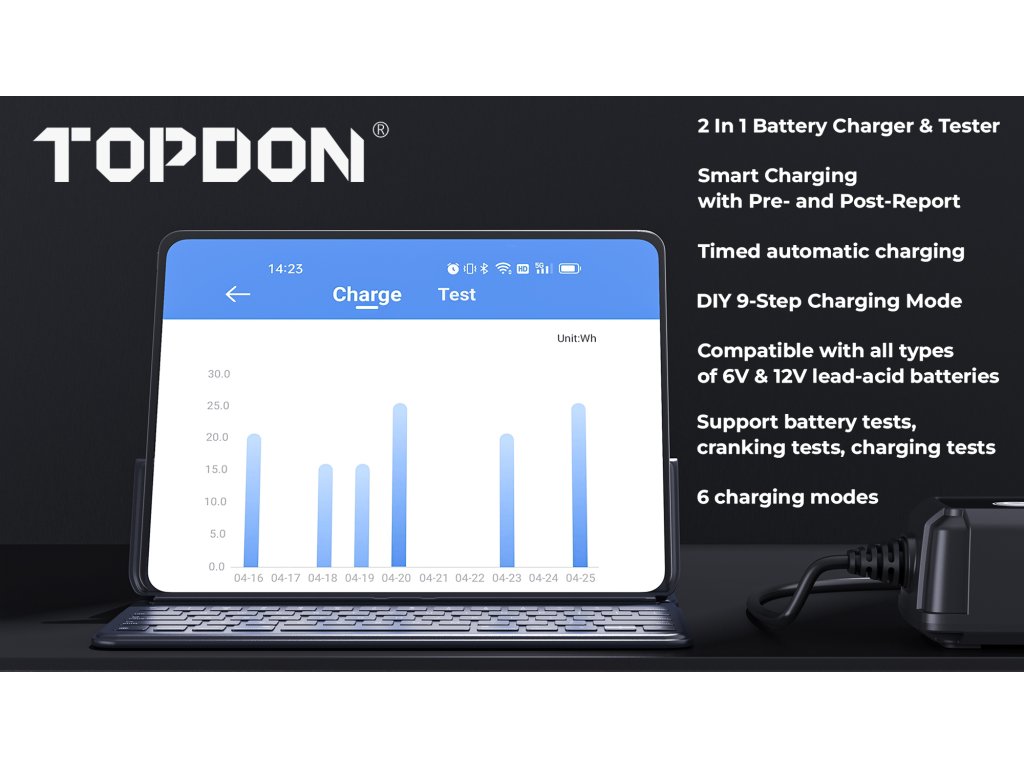 TOPDON TB6000Pro nabízí jako první v oboru inteligentní režim nabíjení, který dokáže zobrazit report před a po nabíjení, který ukazuje přesné srovnání dat.