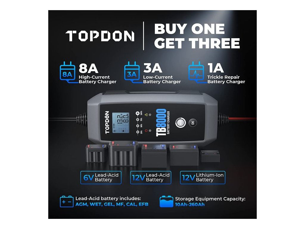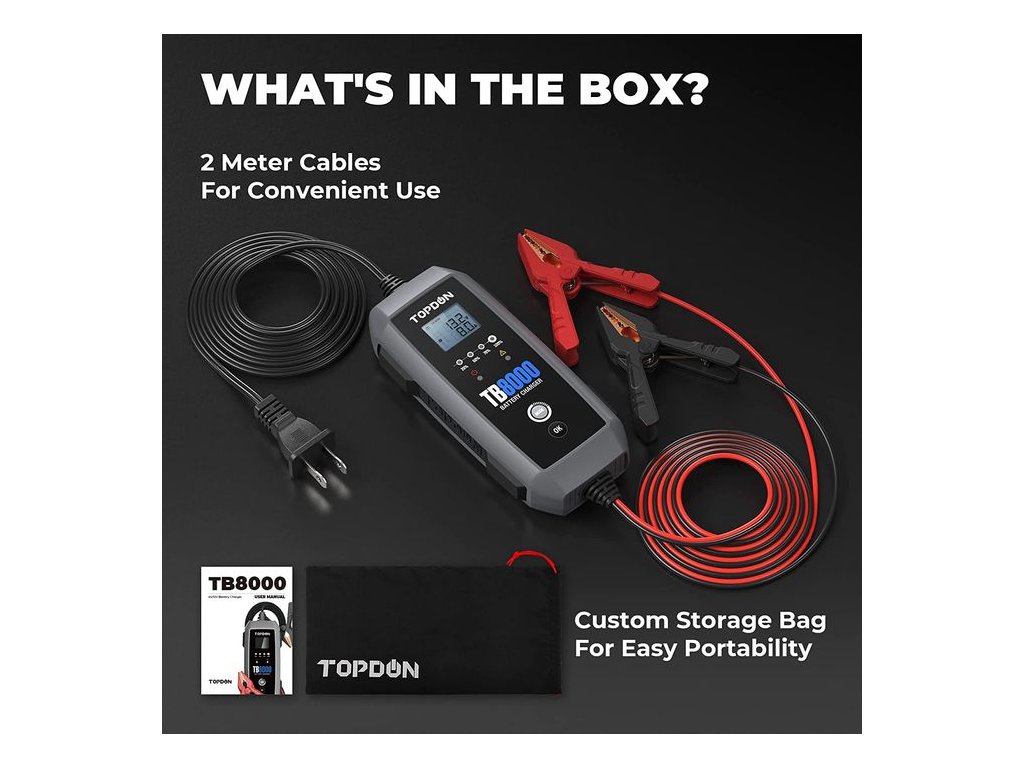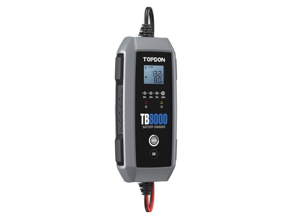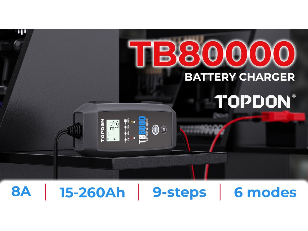 Nabíječka baterií TOPDON TB8000 nabízí dva nabíjecí proudy 8A a 3A pro baterie od 15Ah do 260Ah. S tímto jedinečným nástrojem budete moci nabíjet baterie v automobilech, motocyklech, jachtách, nákladních automobilech, SUV, MPV, traktorech a mnoha dalších. Díky 6-ti nabíjecím režimům si vyberete ten, který bude nejvíce vyhovovat vašim potřebám!