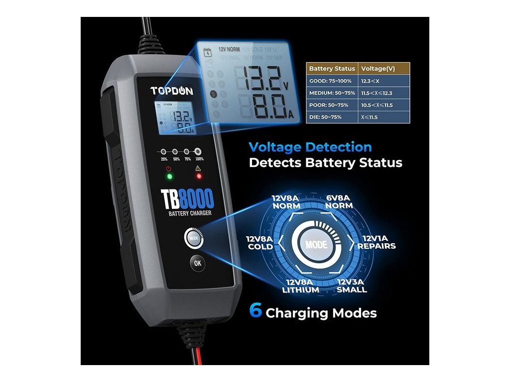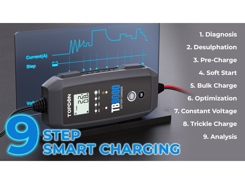 9stupňový systém inteligentního nabíjení TB8000 poskytuje uživatelům špičkovou technologii, která automaticky identifikuje stav baterie a dodává nejvhodnější proud. Je to také pokročilý udržovač baterie, nabíječka a desulfátor v jednom. Zvládne nabíjet i vybité baterie a díky diagnóze a desulfataci prodlužuje životnost nabíjené baterie. S tímto zařízením se již nemusíte obávat poškození baterií!