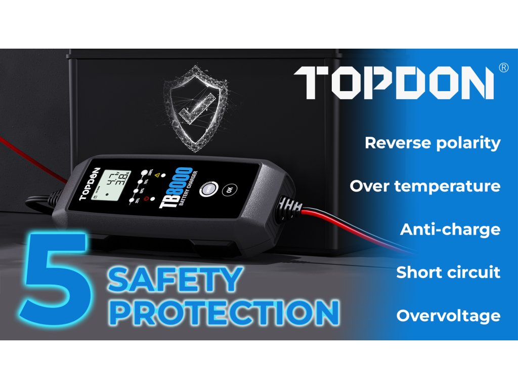 TOPDON TB 8000 nabízí vynikající bezpečnostní funkce díky 5-ti vestavěným systémům ochrany proti přepólování, zpětnému nabíjení, zkratu, přehřátí a přepětí. Navíc je tato nabíječka baterií vybavena inovativní technologií pro eliminaci jisker. Vaše zařízení i baterie zůstávají stále v bezpečí!