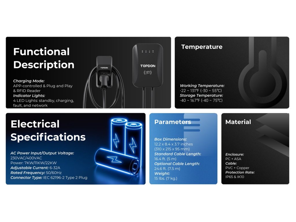 App Control: Tato nabíječka elektromobilů lze ovládat pomocí aplikace (dostupnou jak pro Android, tak pro iOS), která je potřeba nainstalovat do Vašeho chytrého telefonu. Tato aplikace Vám umožní ovládat nabíječku a monitorovat průběh nabíjení z jakéhokoli místa, kde máte přístup k internetu. Díky tomu můžete například vzdáleně zapnout nebo vypnout nabíjení a mít přehled o průběhu nabíjení.