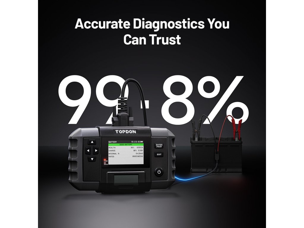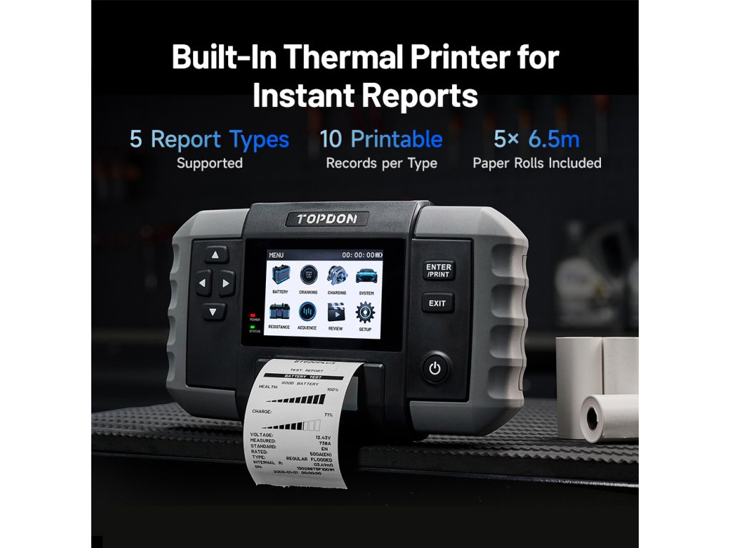 BT600 Plus poskytuje mimořádně přesné výsledky testování již během několika sekund. Měří napětí v rozsahu 0–100 V, odpor v rozsahu 0 m? – 200 ? a analyzuje jak aktuální stav baterie, tak celý startovací a nabíjecí systém vozidla. Výsledek testu můžete přímo vytisknout, sdílet se svými zákazníky nebo uchovávat tiskové záznamy pro budoucí použití. Velký 3,5” barevný displej zobrazuje výsledky jasně a přehledně i na denním světle, zatímco intuitivní ovládání zajistí snadné použití i bez předchozích zkušeností. Vestavěná baterie umožňuje více než 14 hodin provozu na jedno nabití, což z přístroje činí ideální nástroj i pro intenzivní pracovní den.