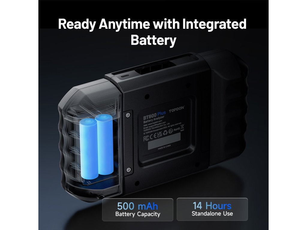 TOPDON BT600 Plus je vyspělý tester baterií a startovacího/nabíjecího systému, ideální pro použití u osobních i nákladních vozidel, motocyklů, lodí nebo karavanů. Oproti běžným testerům je vybaven vlastní baterií o kapacitě 5200 mAh, díky čemuž umožňuje plně samostatný provoz bez nutnosti připojení k napájené baterii – testování je tak možné i v případech, kdy je baterie silně vybitá (již od 2 V).