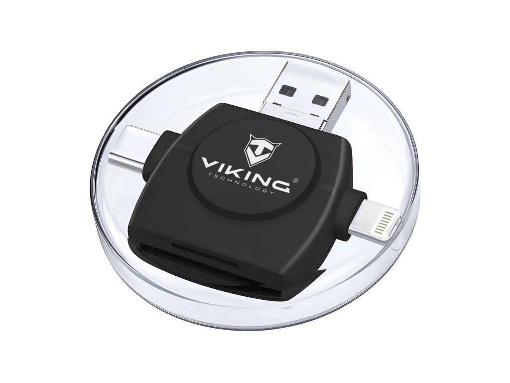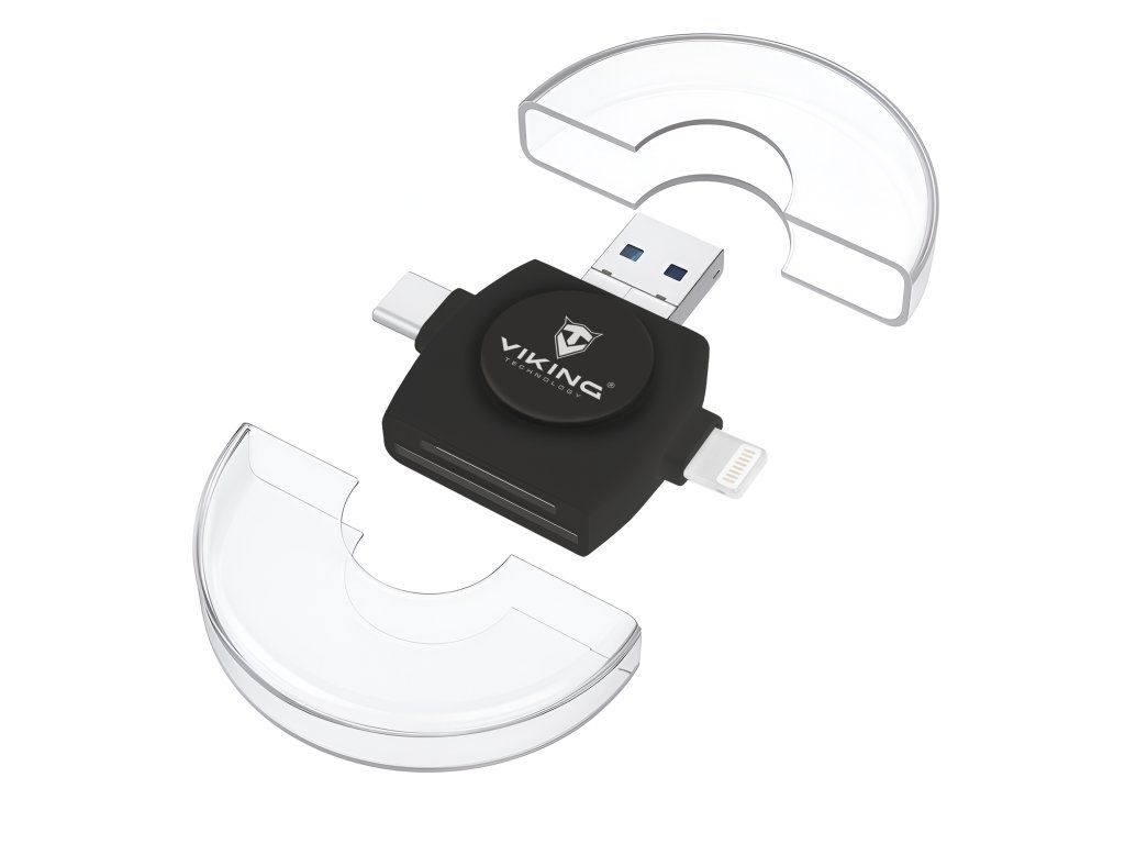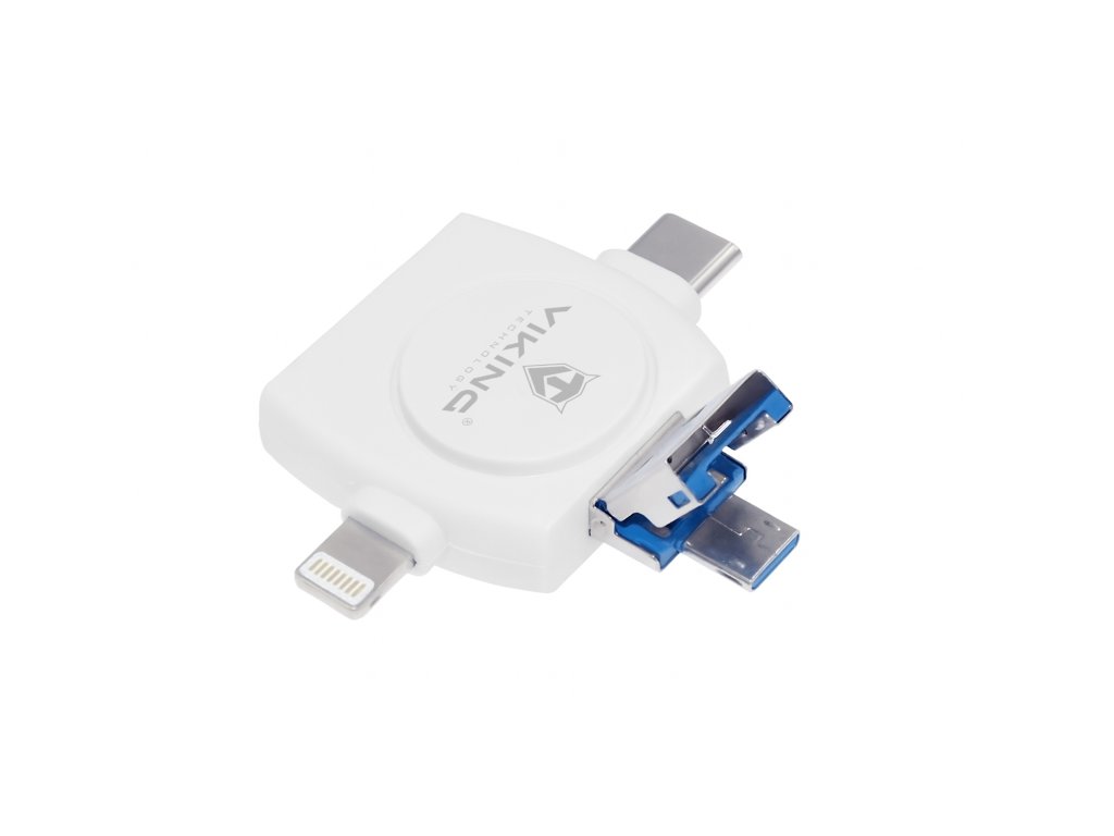 Viking čtečka paměťových karet V4 USB3.0 4v1 • 4 konektory: Lightning, Micro USB, USB-A 3.0, USB-C • Vhodný pro iOS, Android, Windows i Linux • Podpora většiny běžných formátů souborů • Rozšíření paměti telefonu, tabletu nebo notebooku • Malé, lehké zařízení s ochranným pouzdrem • hmotnost 10g
