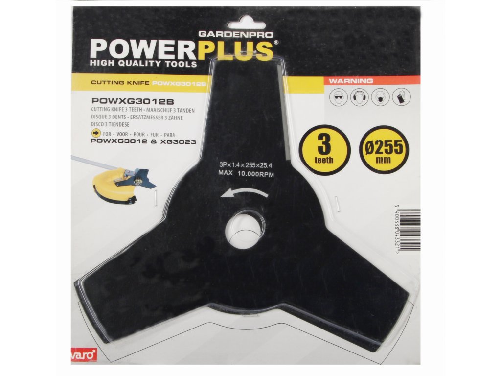 Žací nůž pro křovinořezy 255mm 3T. Tento žací nůž POWXG3012B od POWERPLUS je určen pro všechny křovinořezy s upínacím průměrem 25,4 mm. Kotouč má průměr 255mm a síla materiálu je 1,4mm., Průměr žacího nože - 255 mm, Počet zubů - 3, Upínací otvor - 25,4 mm, Tloušťka - 1,4 mm, Hmotnost - 0,3 kg...